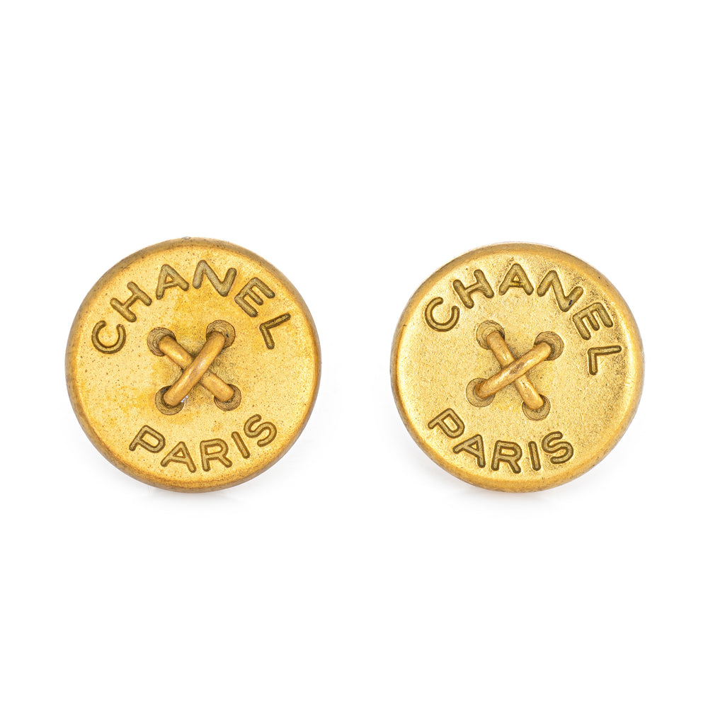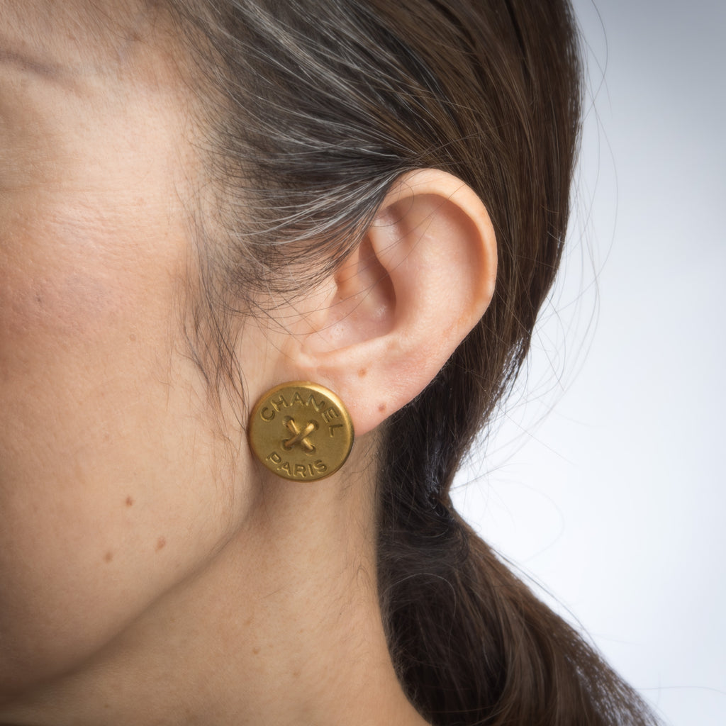 Chanel Paris Button Earrings Circa 1994 Yellow Gold Tone Round Clip On