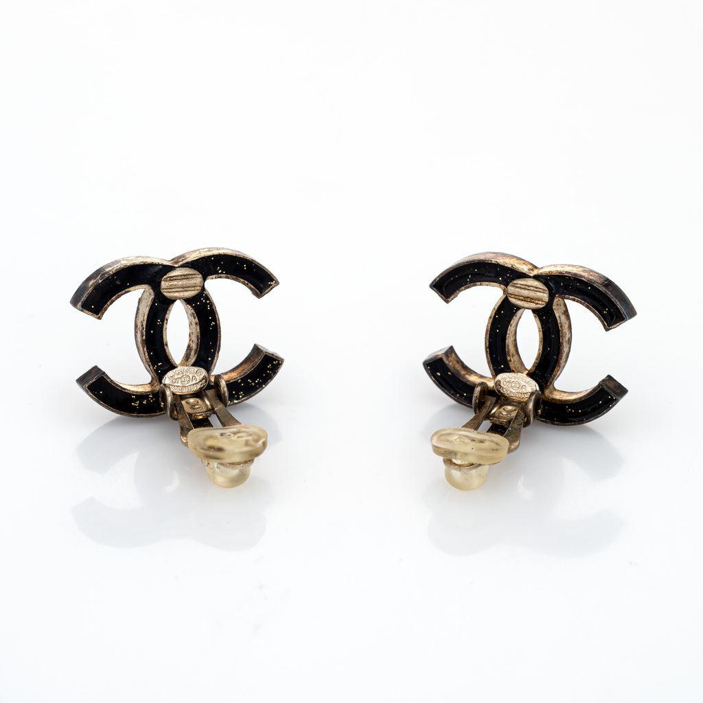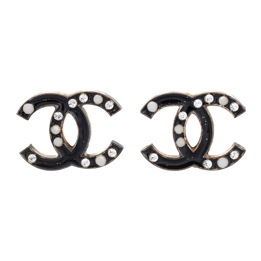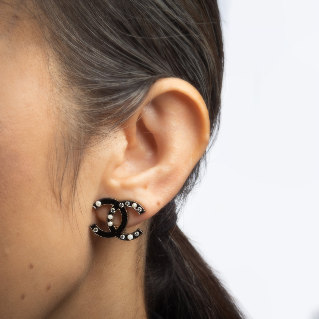 The earrings feature the CC logo rendered in black lacquer with crystal and faux pearl detail. The earrings are fitted with clip on backings for non-pierced or pierced ears.