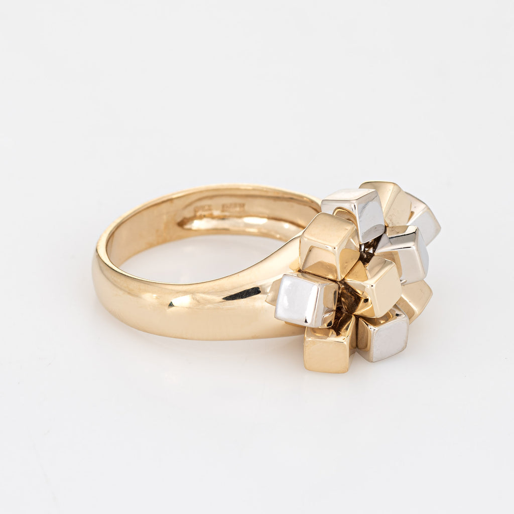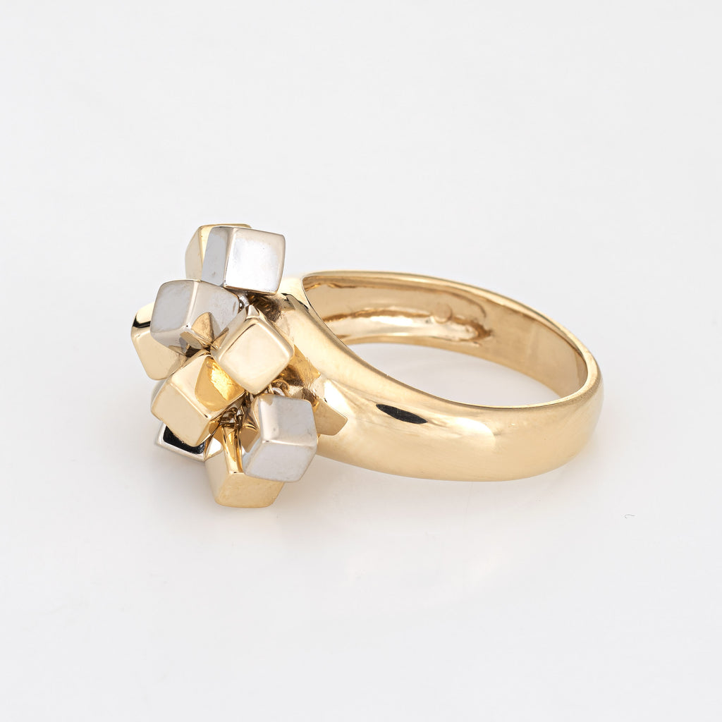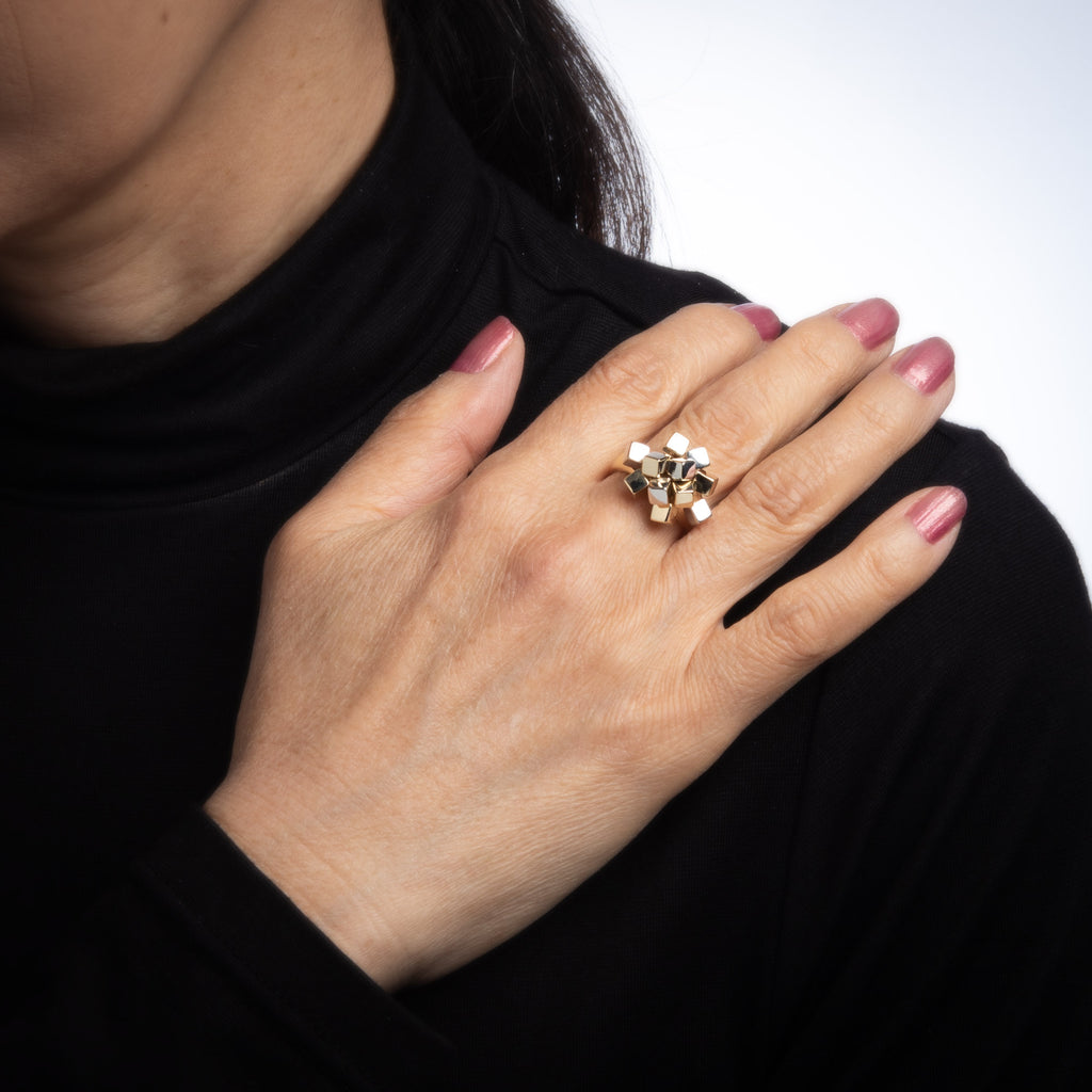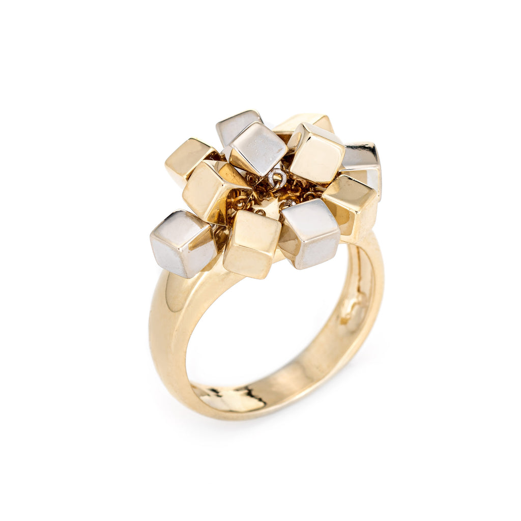 The fun and stylish ring features yellow & white gold cubes, attached to the mount with rings that allow for movement. The cocktail ring makes a nice statement on the hand. The medium rise ring (8.8mm - 0.34 inches) sits comfortably on the finger.