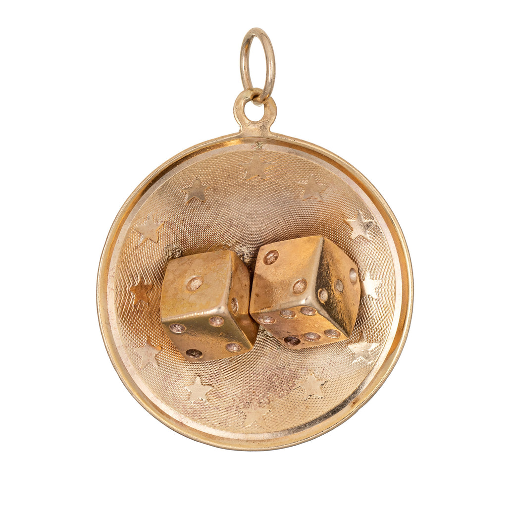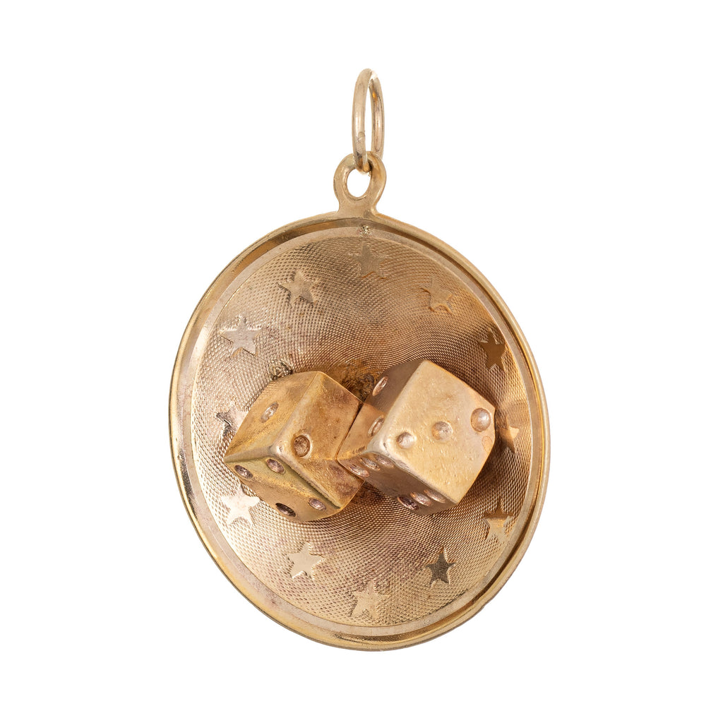 The charm (1") features a two dice set into a concave round mount. The center of the charm is satin finished with a halo of stars around the dice. The charm features a small bale that is designed to be attached to a charm bracelet. It can also be worn as a pendant on a chain.