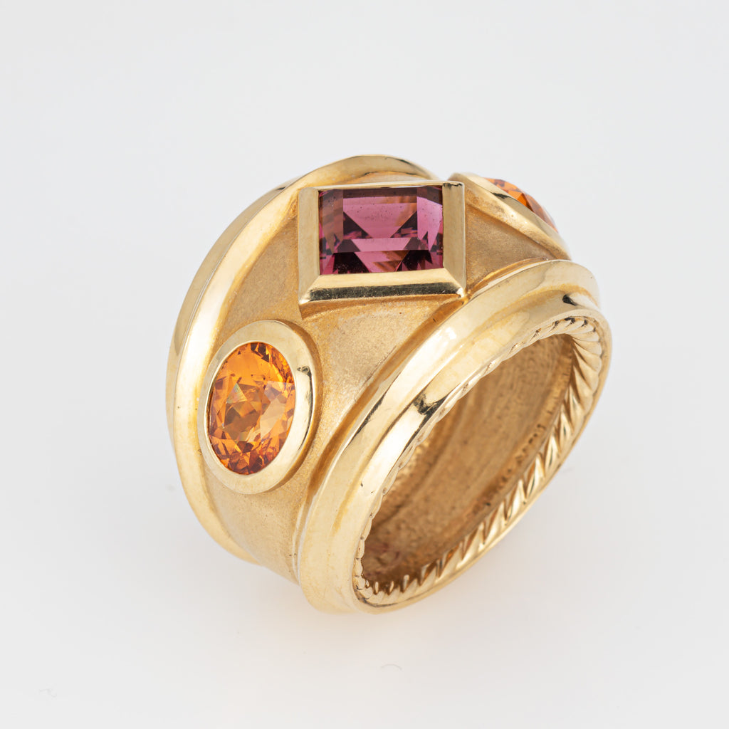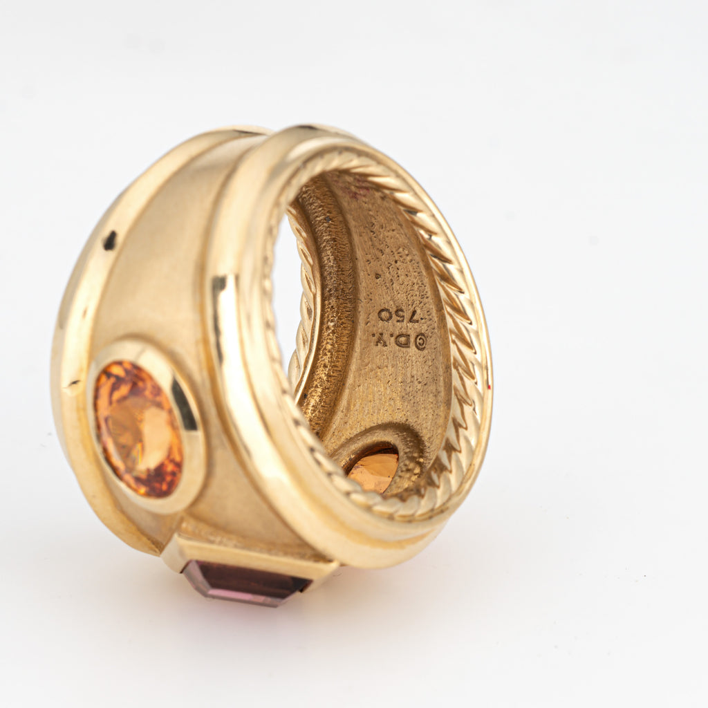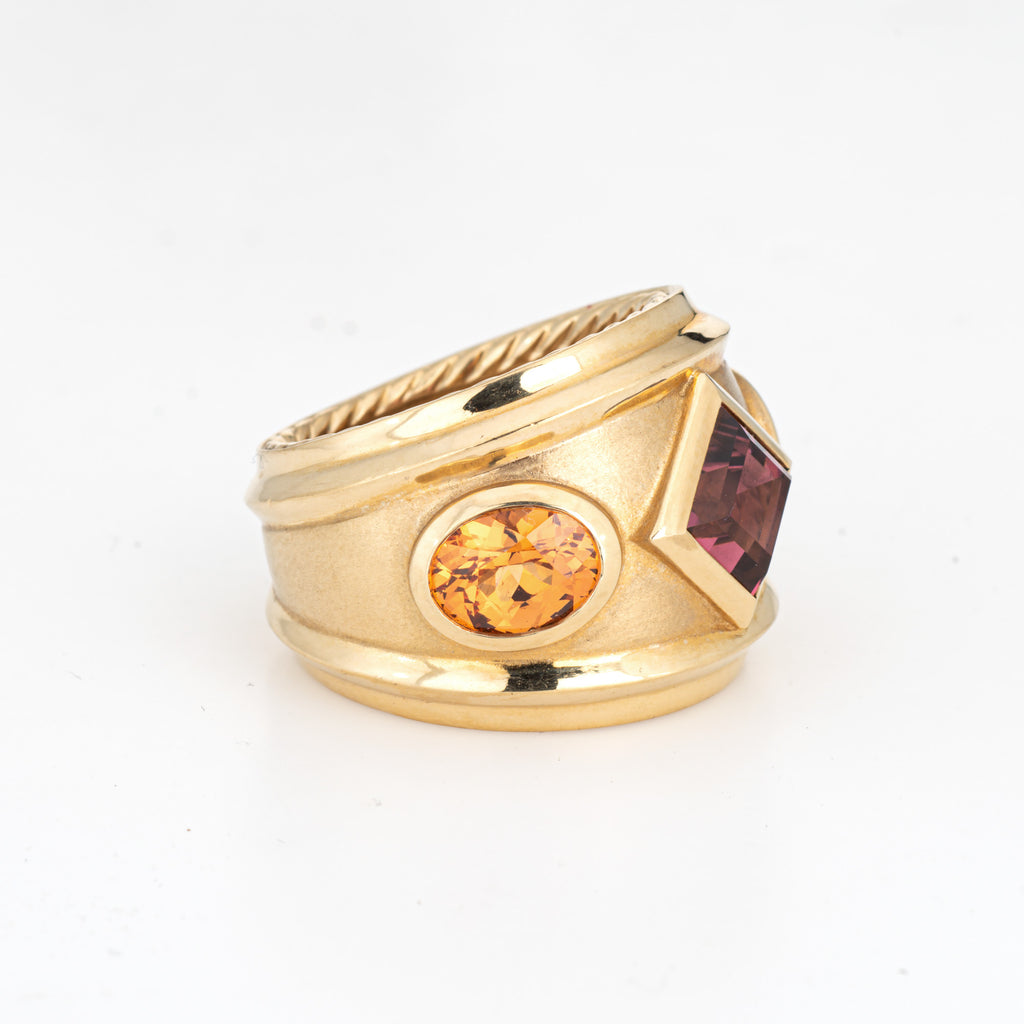 The out of production David Yurman ring is set with a center set Rhodolite garnet measuring 6mm. Two citrines measure 7mm x 5.5mm. The gemstones are in very good condition and free of cracks or chips. Weighing a hefty 16.6 grams the ring makes a great statement on the hand. The ring has a medium rise (6.5mm - 0.25 inches).