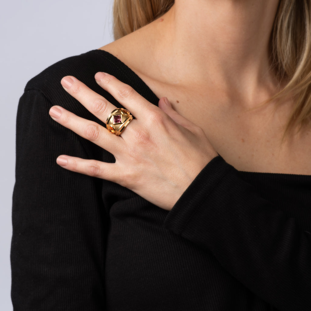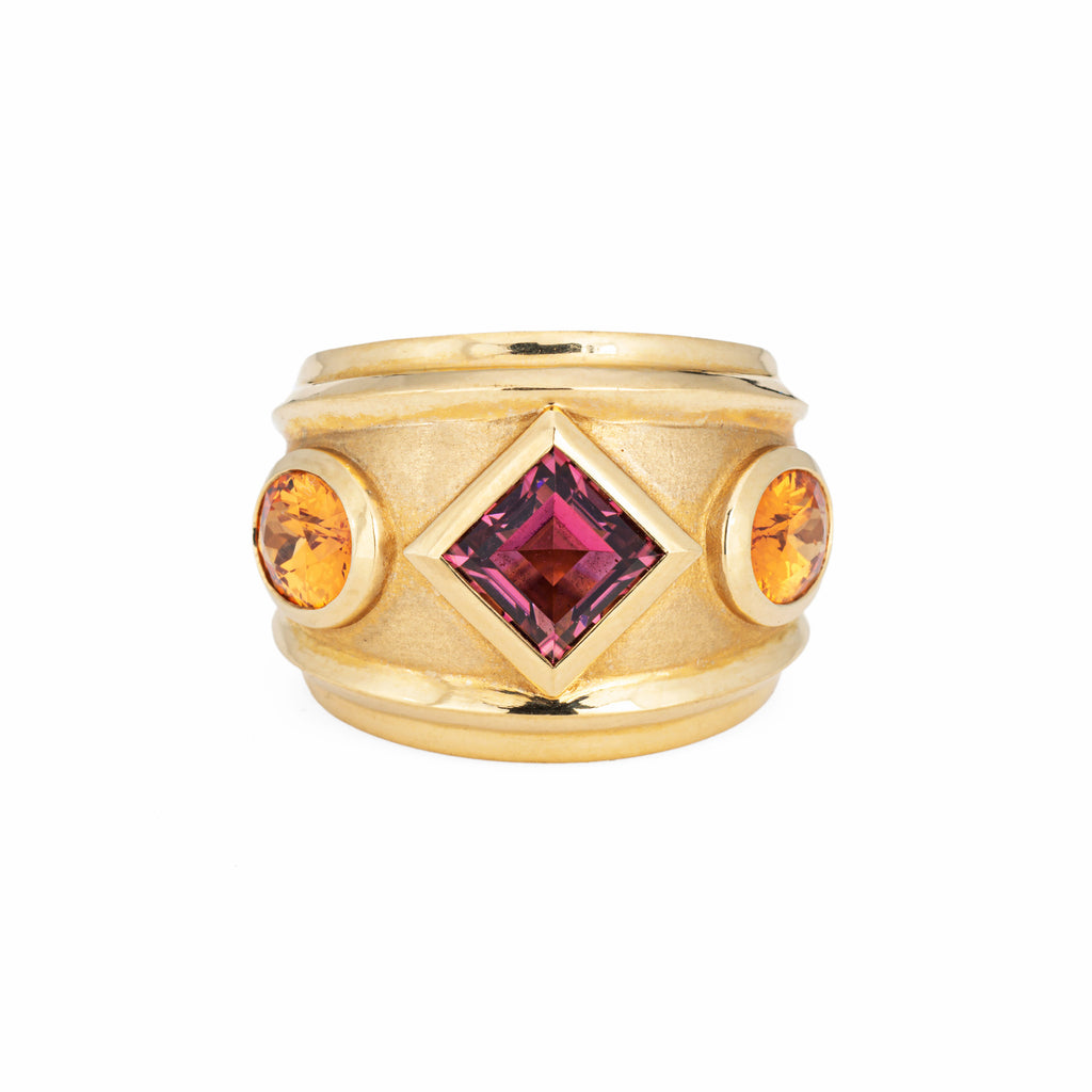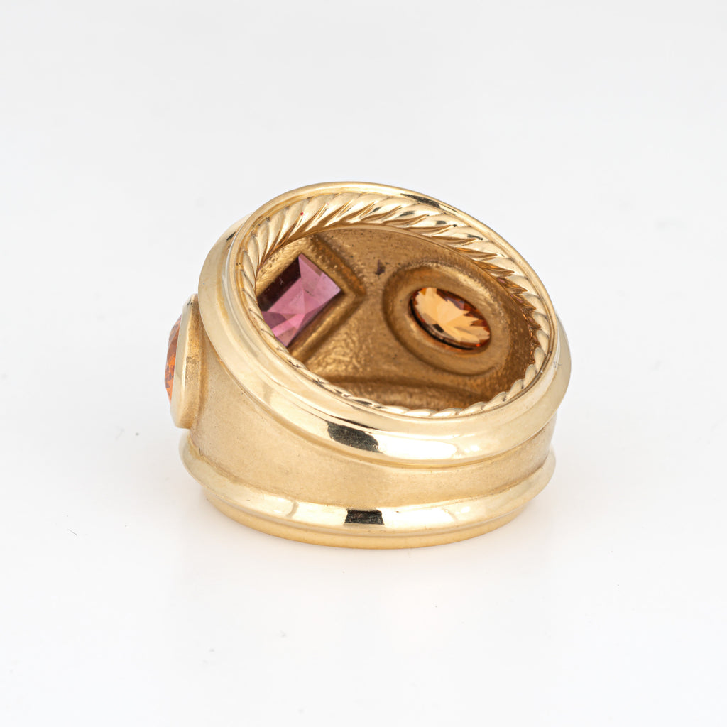 The out of production David Yurman ring is set with a center set Rhodolite garnet measuring 6mm. Two citrines measure 7mm x 5.5mm. The gemstones are in very good condition and free of cracks or chips. Weighing a hefty 16.6 grams the ring makes a great statement on the hand. The ring has a medium rise (6.5mm - 0.25 inches).