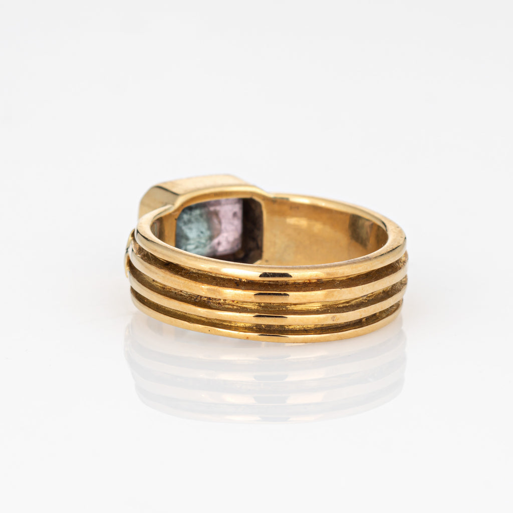 Bezel set in an east to west design, the watermelon tourmaline band is great worn alone or stacked with your other fine jewelry. The ring is in very good condition and was lightly cleaned and polished.