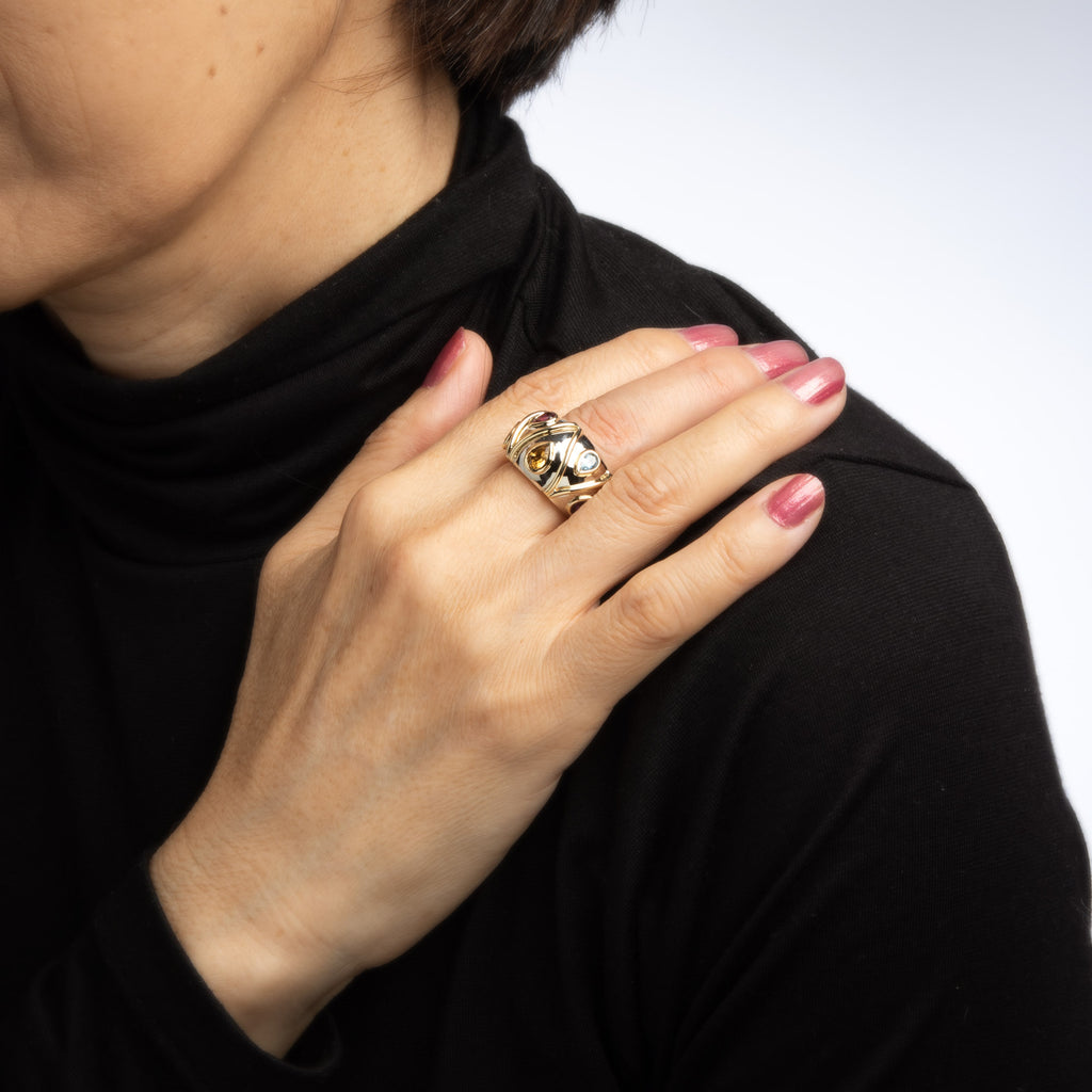 The wide band (13.5mm - 0.53 inches) is set with a colorful array of semi-precious gemstones with accenting 14k yellow gold detailing. The low rise ring (5.5mm - 0.21 inches) sits comfortably on the finger.