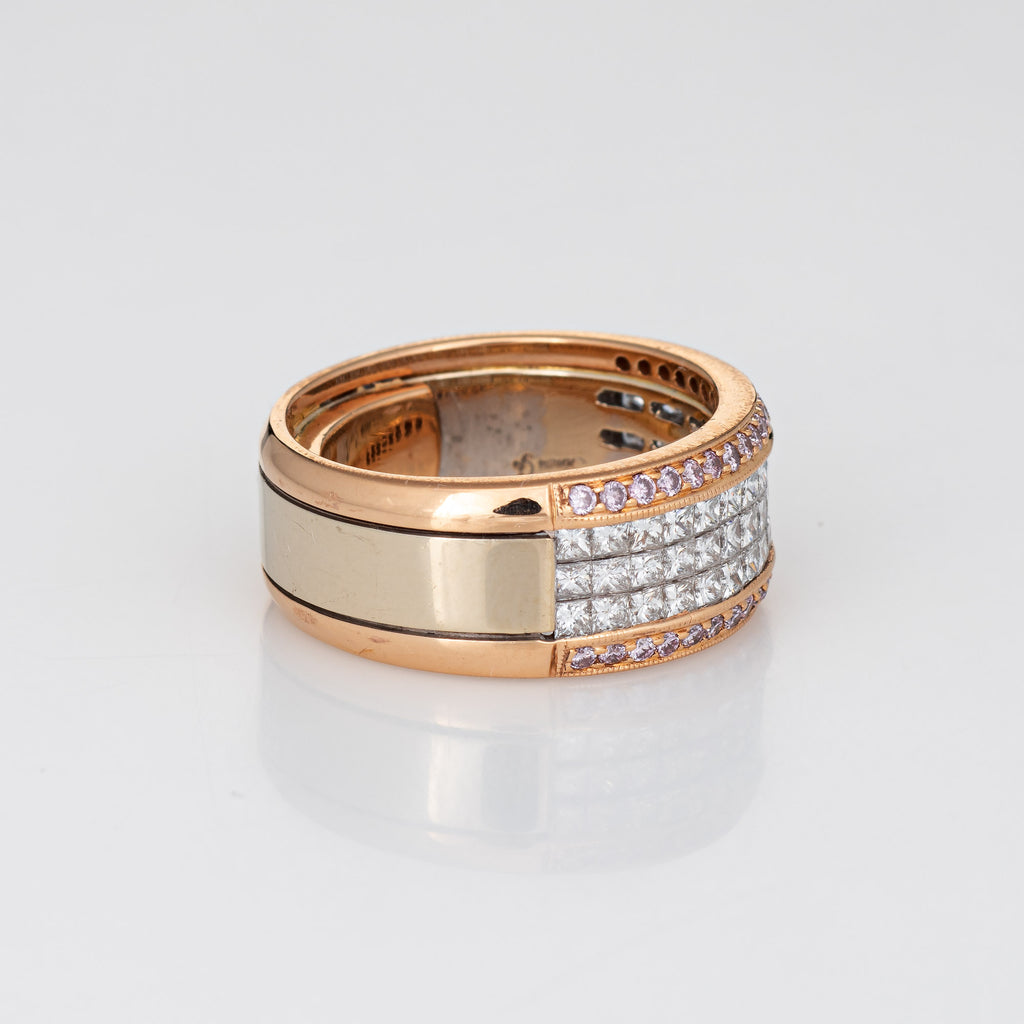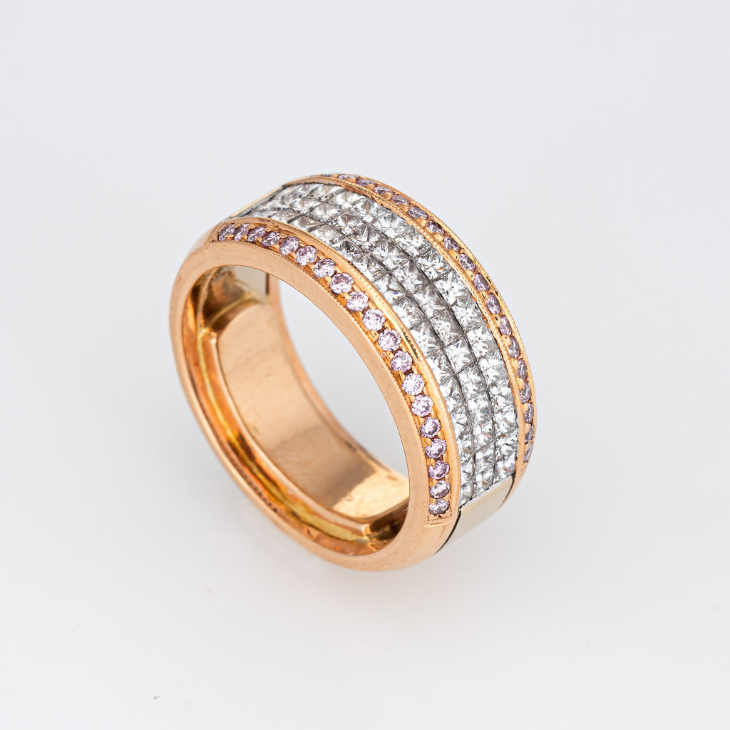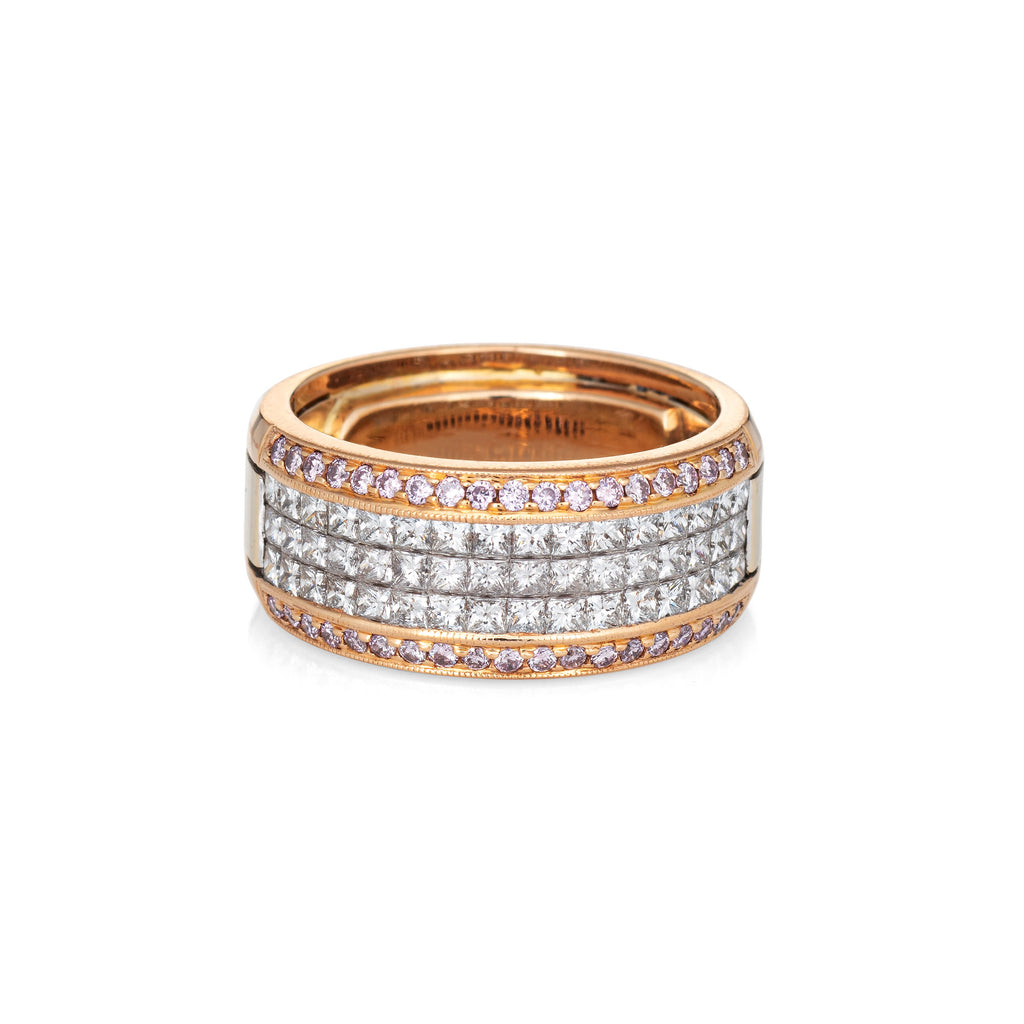 Dusky pink diamonds frame the center set princess cut diamonds. With the closing of the Argyle diamond mine in Australia, pink diamonds have become very desirable. The band sits flat on the finger, rising 2.5mm (0.09 inches). The ring retailed for an estimated $9,500.