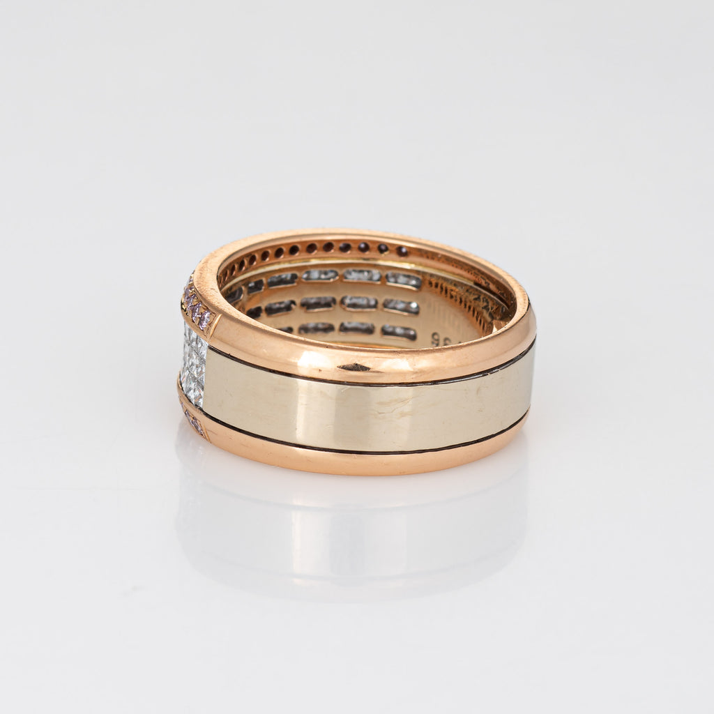 Stones: Princess cut diamonds total 1.36 carats (estimated at G color and VS2-SI1 clarity). The pink diamonds total an estimated 0.19 carats.