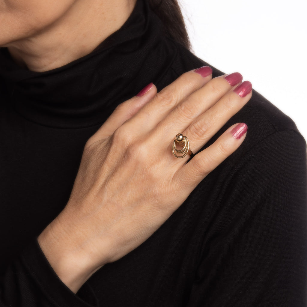 In 1971 Norman Teufel created the 'swinger' ring. Stainless steel ball bearings in combination with fine jewelry components such as 18 & 14 karat gold and diamonds were used to create the unique spinning rings. This ring (circa 1975) is comprised of three oval components that spin in fluid motion.