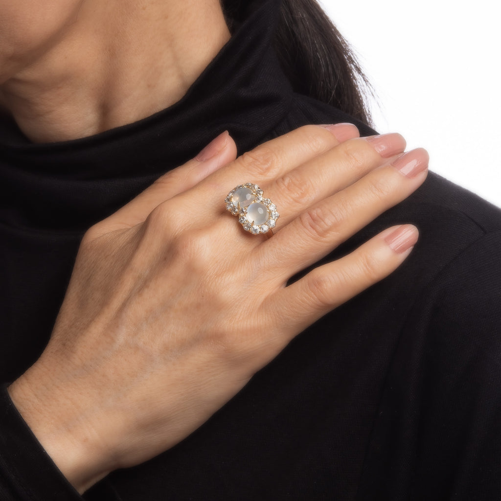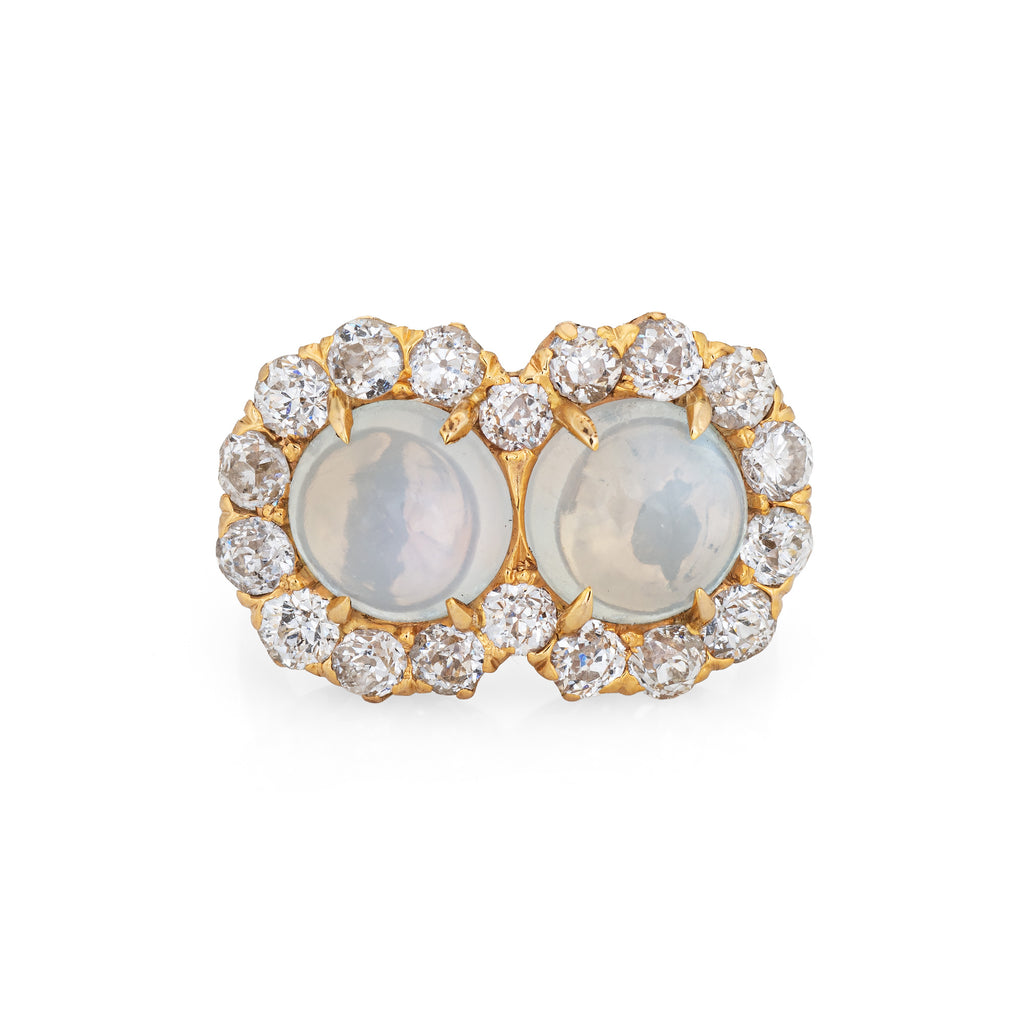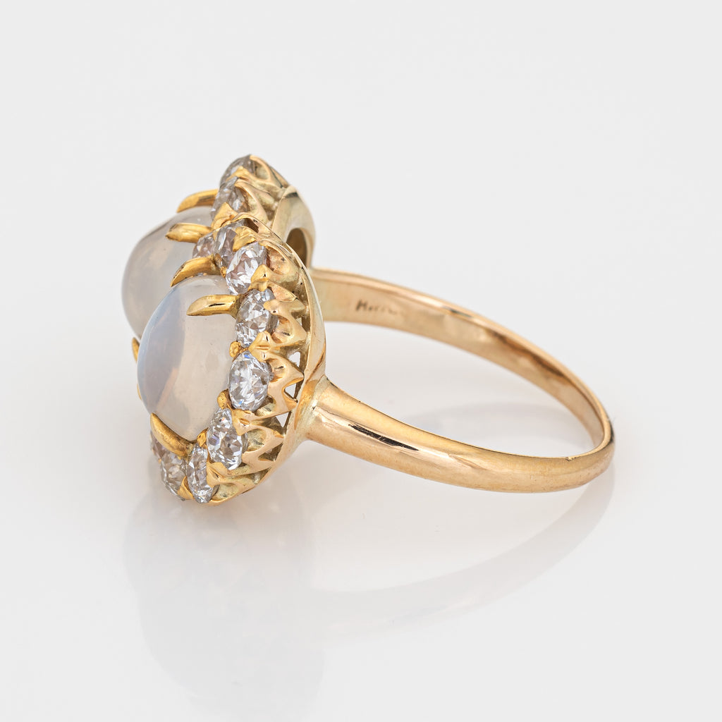The moonstones cast a lunar glow with beautiful blue color flashes evident with every movement of the ring. Shimmering old mine cut diamonds border the moonstones in a double halo design. The medium rise ring (7mm - 0.27 inches) sits comfortably on the finger. Great for wear as an alternative engagement ring or right hand ring for everyday wear.