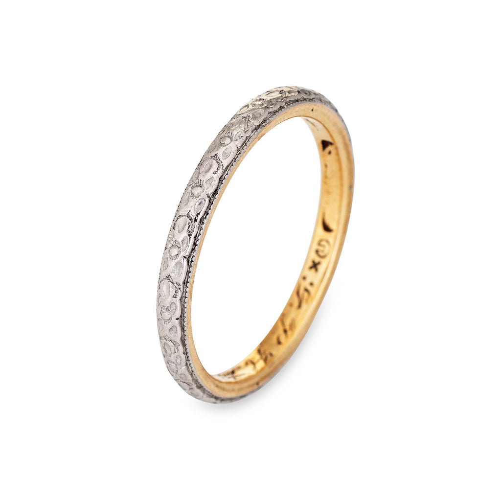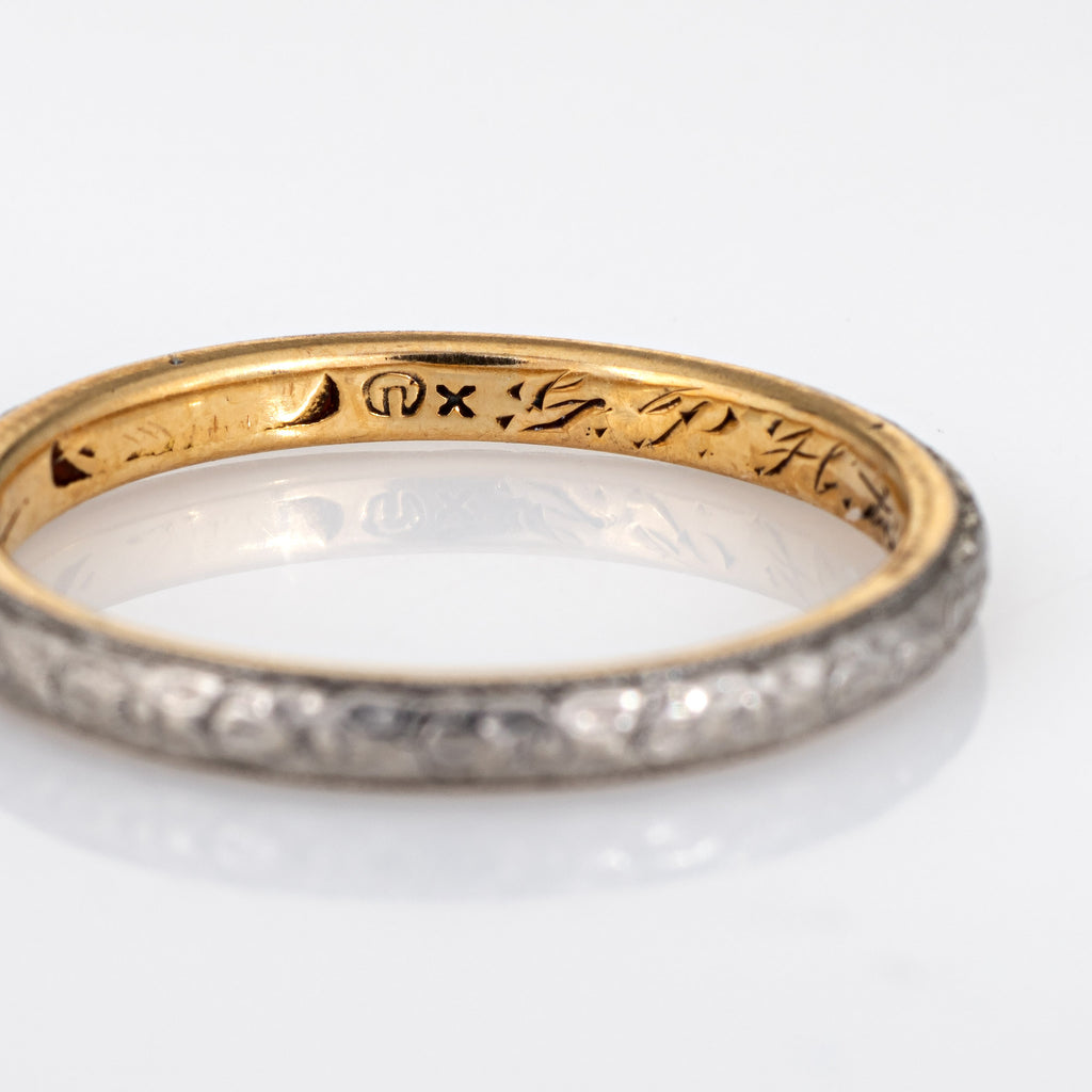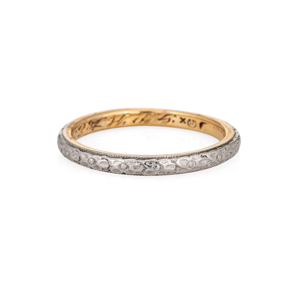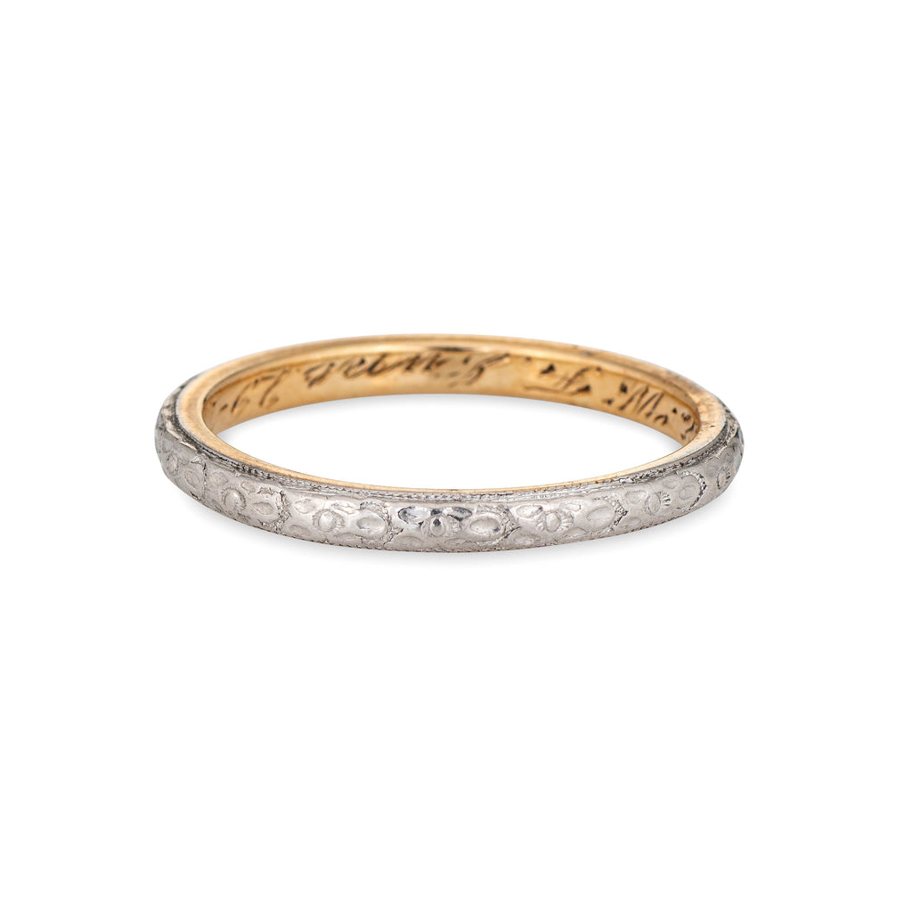 Finely detailed antique Edwardian era wedding band (circa 1914) crafted in platinum & 14k yellow gold.