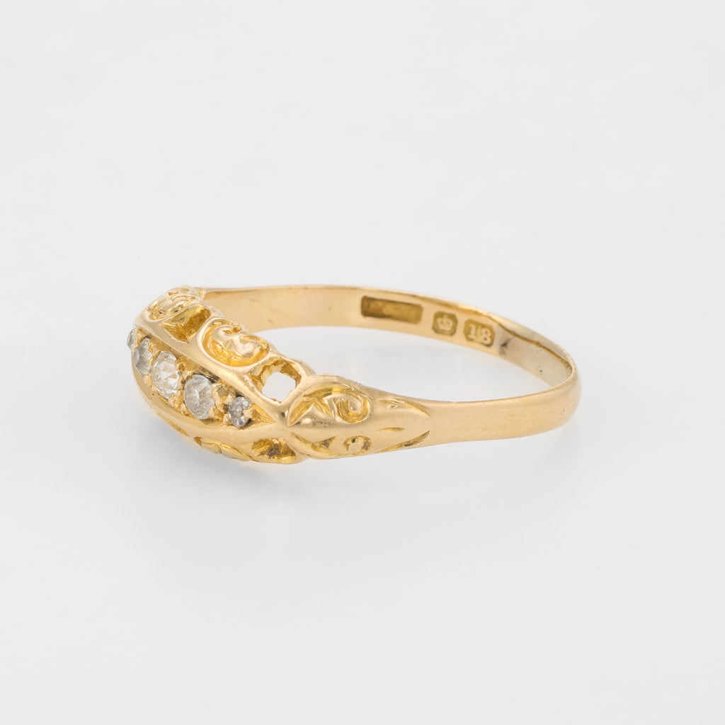 Finely detailed antique Edwardian era ring set with 5 graduated old mine cut diamonds (circa 1910s), crafted in 18 karat yellow gold.