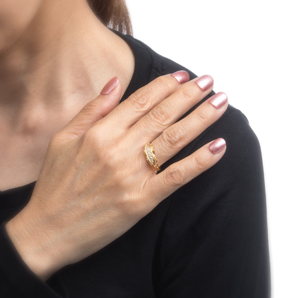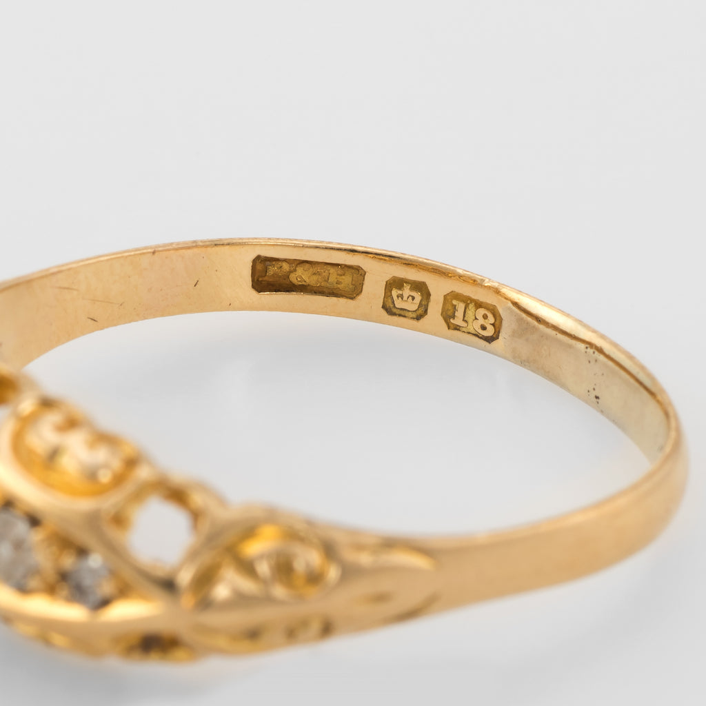 Metal & Hallmark: 18 karat yellow gold. The ring features several British hallmarks. The band is marked "18" for 18 karat gold, a crown and the Makers Mark "P&H"