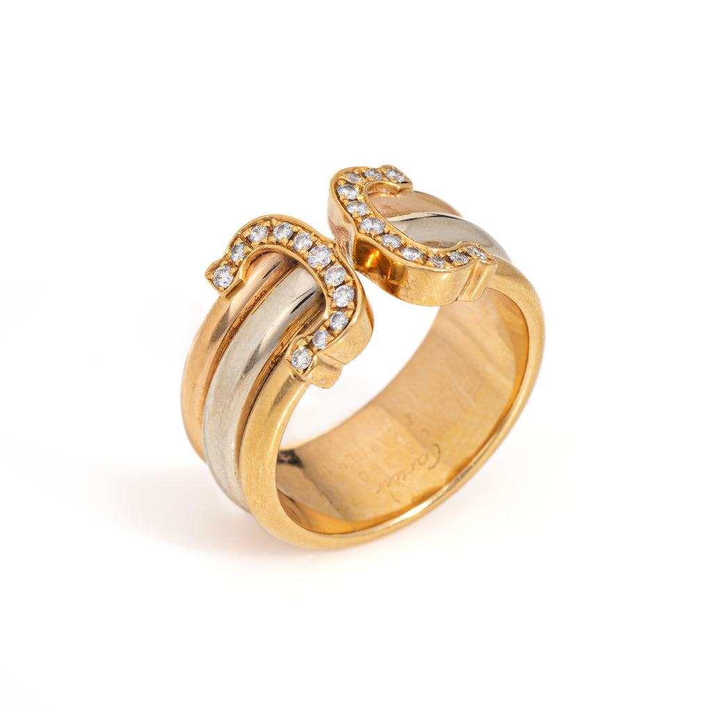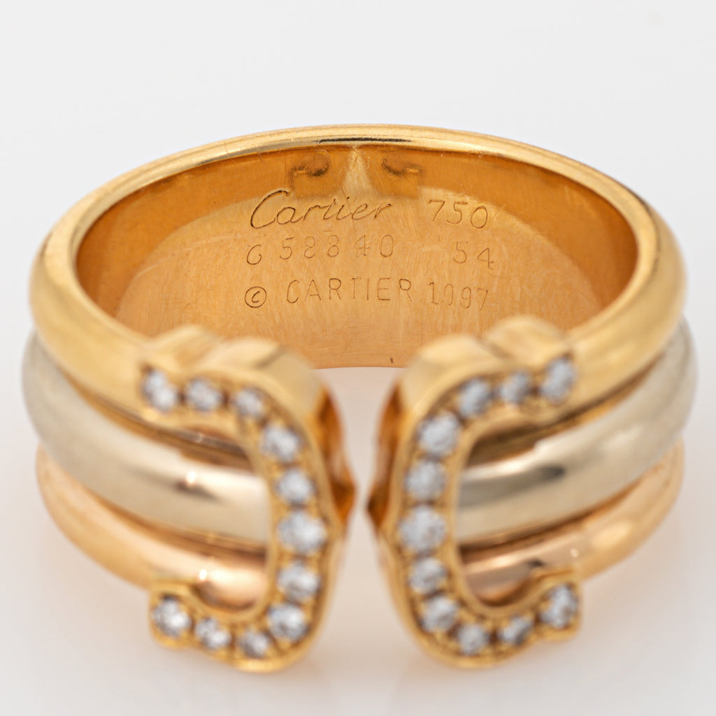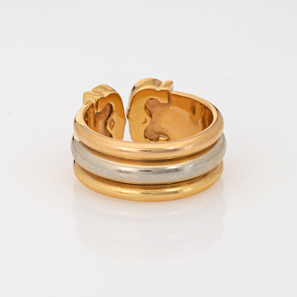 Incorporating its iconic "C" motif into the rings design, the Cartier band is crafted in 18k yellow, rose and white gold. The ring is great worn alone or stacked with your fine jewelry from any era and would also make a unique choice as an alternative wedding ring. Dating to 1997the ring is an out of production Cartier design. No Cartier box or papers.