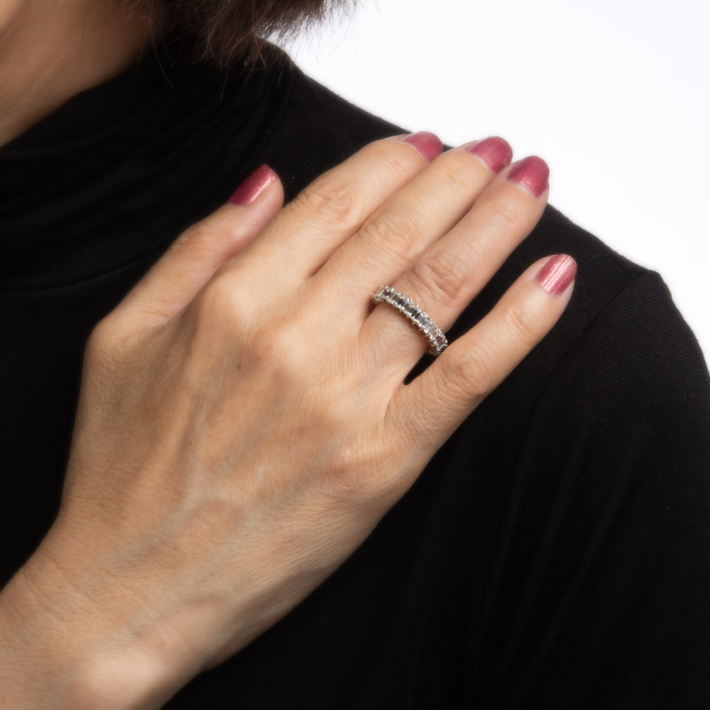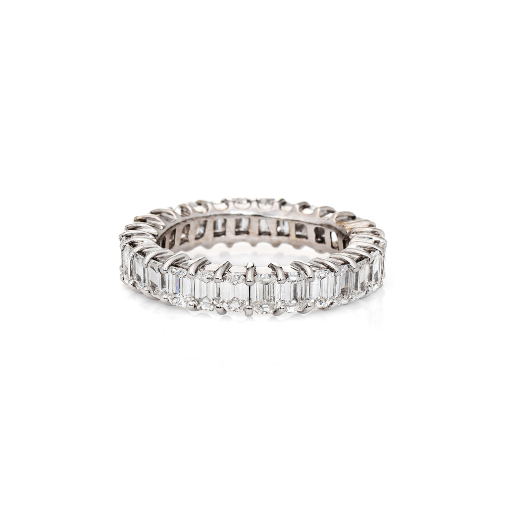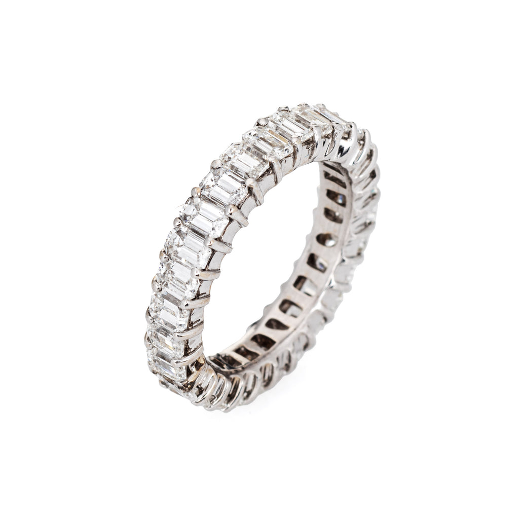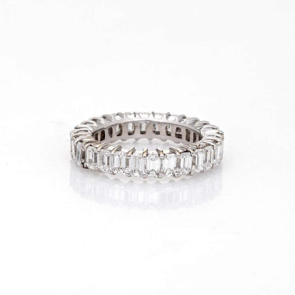 The ring epitomizes vintage charm and would make a lovely alternative wedding band. The emerald cut diamonds are eye clean and offer great sparkle and fire. The ideal band for wear alone or stacked with your jewelry from any era.