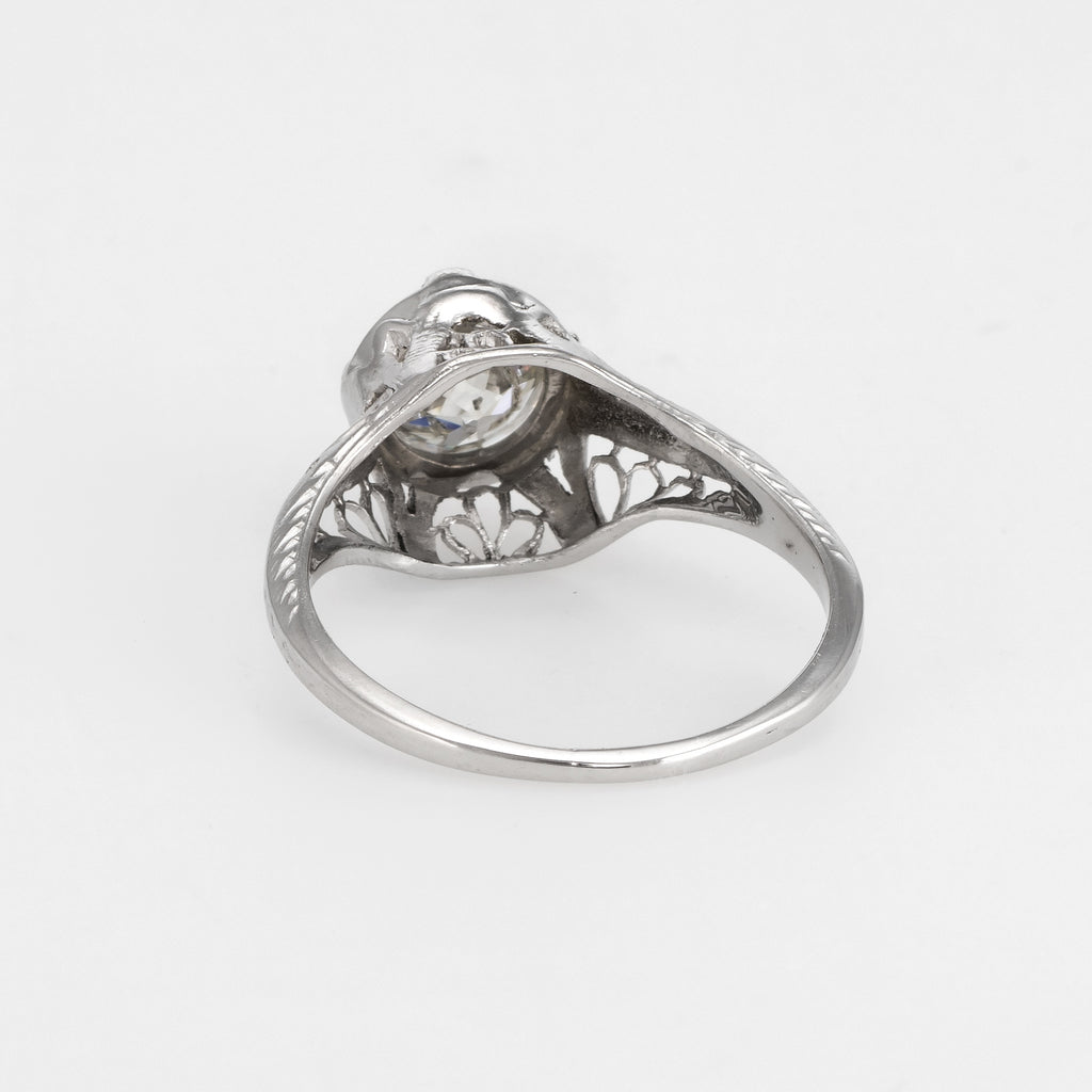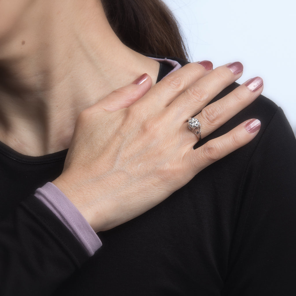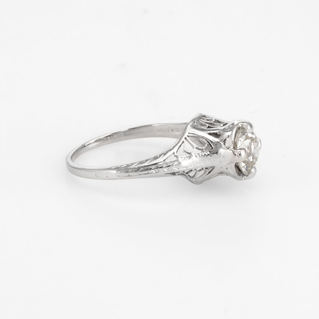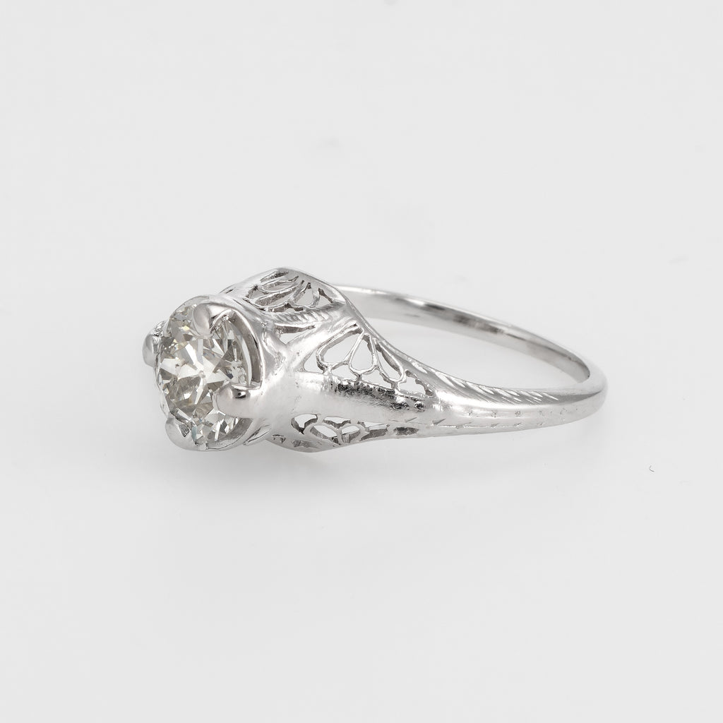 The ring epitomizes vintage charm and would make a lovely alternative engagement ring. The lacy filigree gallery mount terminates to the four pronged round setting. The diamond faces up nicely and offers good sparkle and fire. Also great worn as a right hand or cocktail ring.