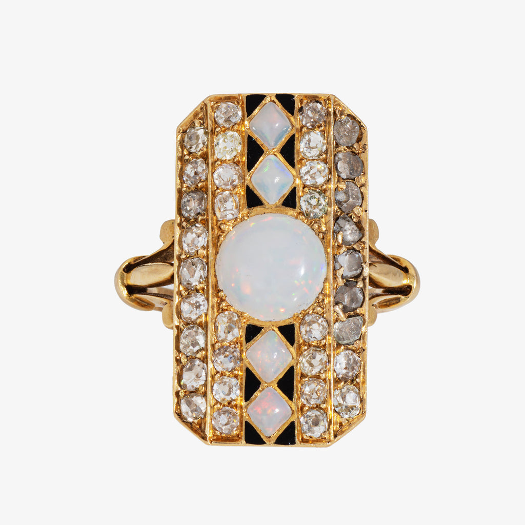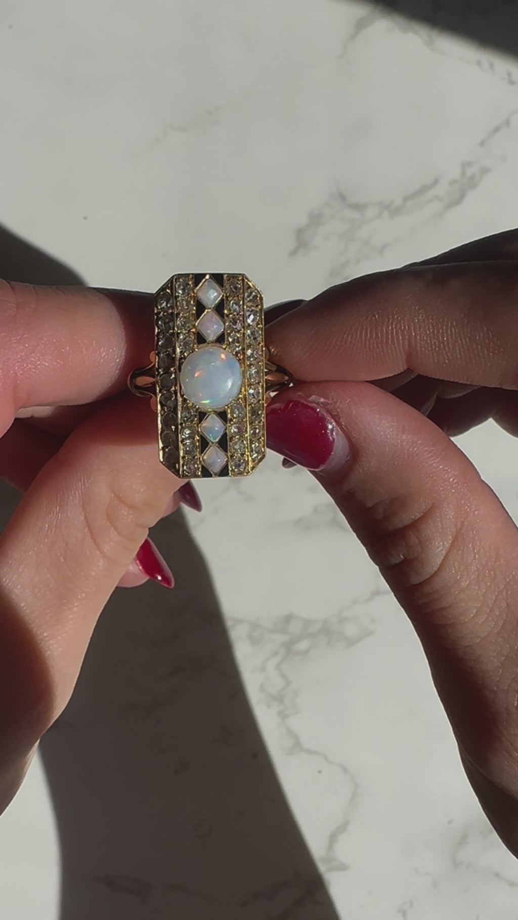 The delightful ring is a feast for the eyes! With a row of colorful opals to the center & bordering black enamel, the old mine cut diamonds offer a beautiful shimmer with every movement of the ring. The elongated cocktail ring has a low profile and sits flat and comfortably on the hand (rises 3.5mm or 0.13 inches). 7 of the diamonds have been replaced over the years (rose cuts) with one diamond recessed into the mount. Due to the age of the ring, we decided not to replace the diamond and has been left in tact within the mount. The ring has also been resized and re-shanked (in 14k gold).