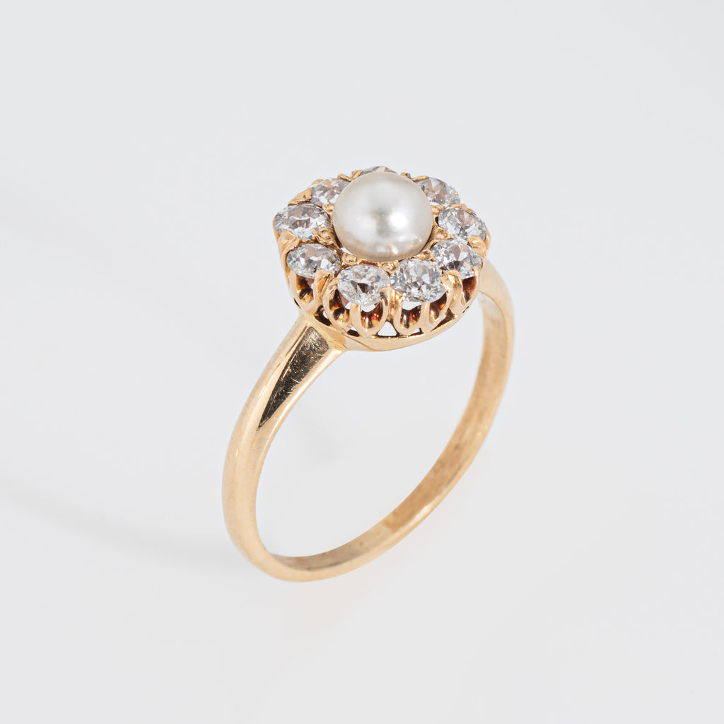 Stones: Pearl measures 4mm, accented with 9 estimated 0.05 carat old mine cut diamonds. The total diamond weight is estimated at 0.45 carats (estimated at I-J color and SI2-I1 clarity). The pearl is lustrous and in good condition.