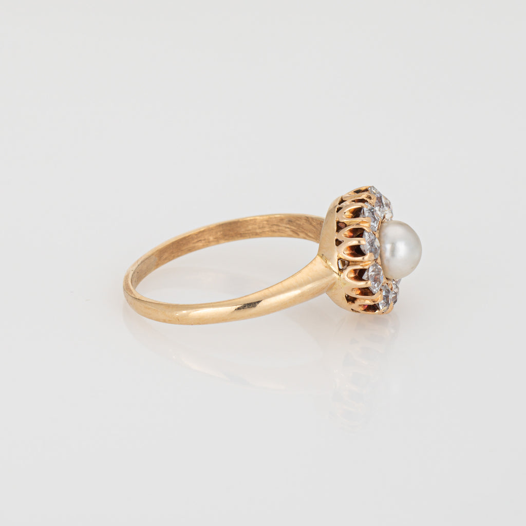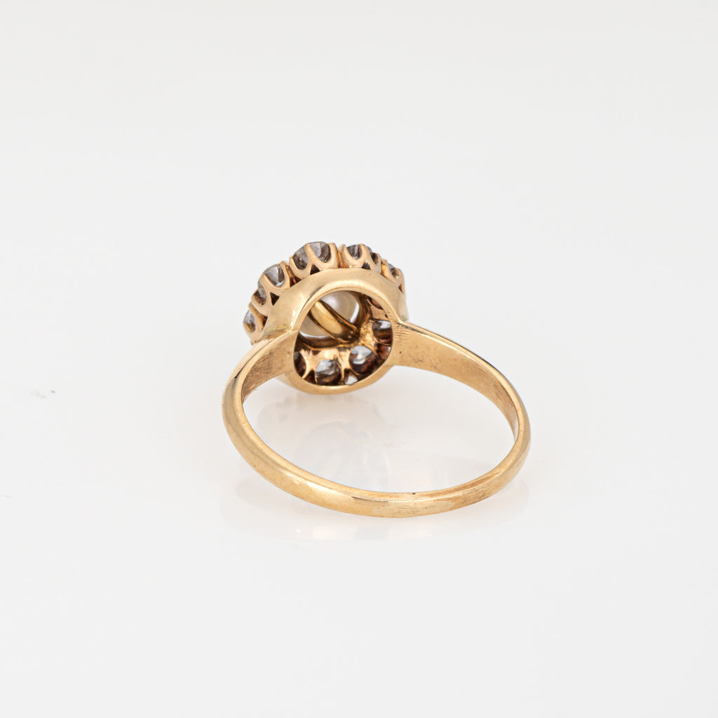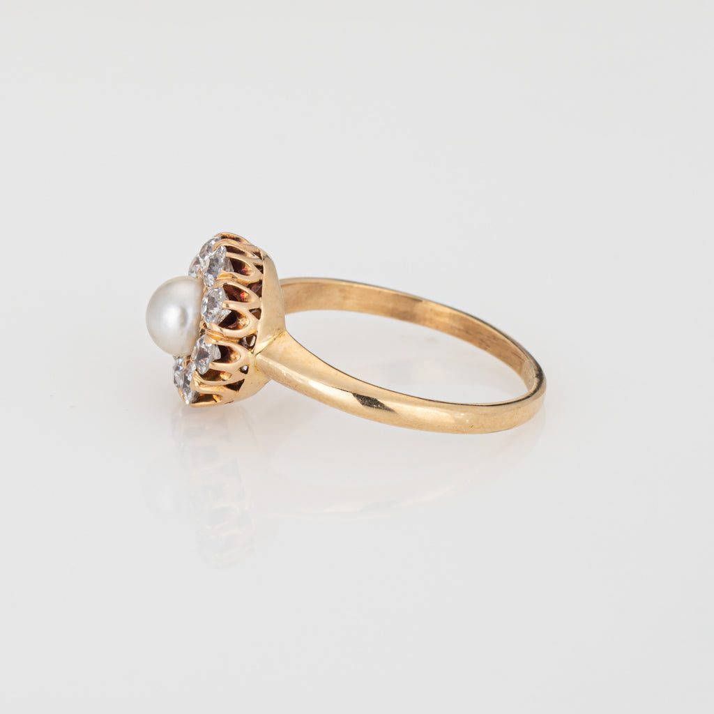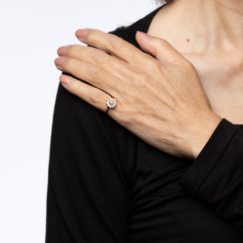 The center set pearl is securely set in the mount, bordered with a halo of sparkling old mine cut diamonds. Smaller in scale the cluster ring has a low profile (rise is 6mm - 0.23 inches) and sits nicely on the finger. Ideal worn as an alternative engagement ring or a right hand ring for everyday wear.