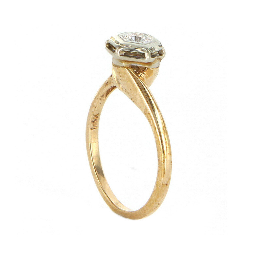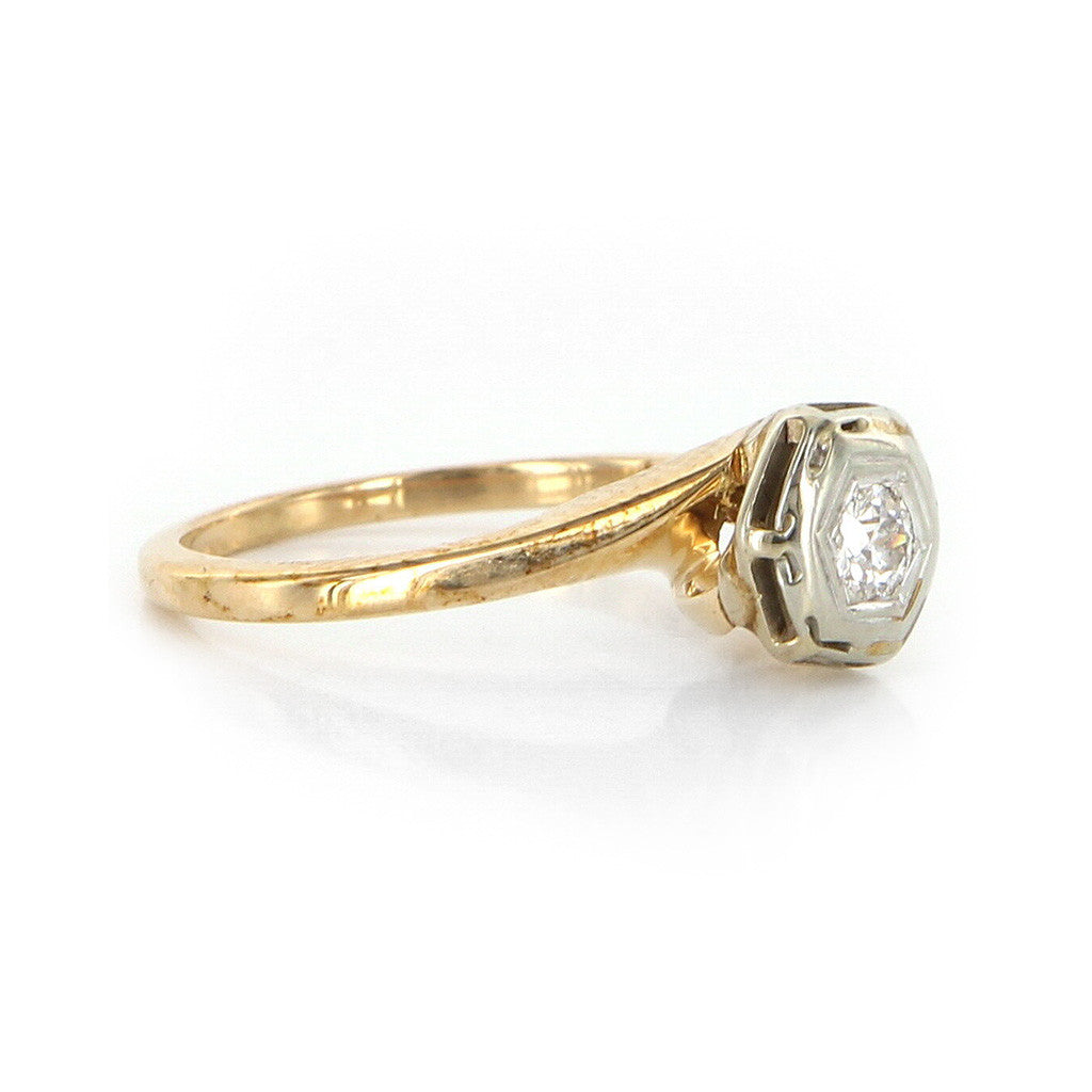 Offered for sale is a truly superb Art Deco era engagement ring (circa 1920s to 1930s), crafted in 14 karat yellow gold .One .15 carat estimated old European cut diamond is set into an ornate band. The deco ring is in excellent condition.
