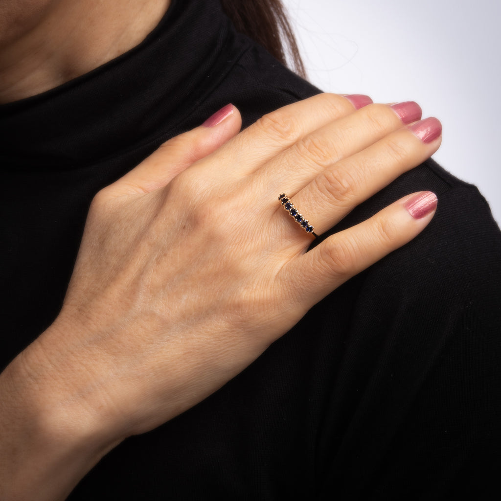 The sapphires are set in secure pronged mounts in a single band. The ring is great worn alone or stacked with your fine jewelry from any era.