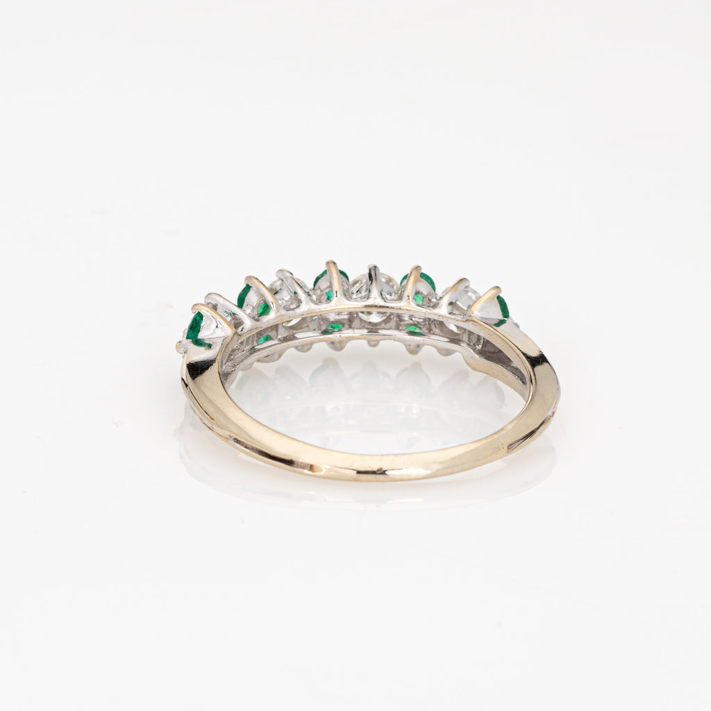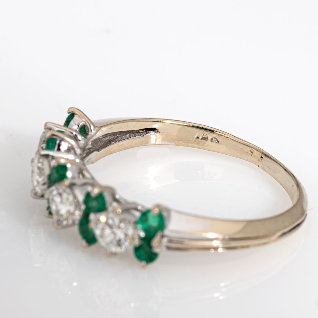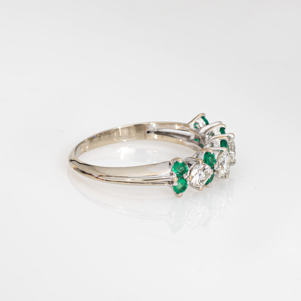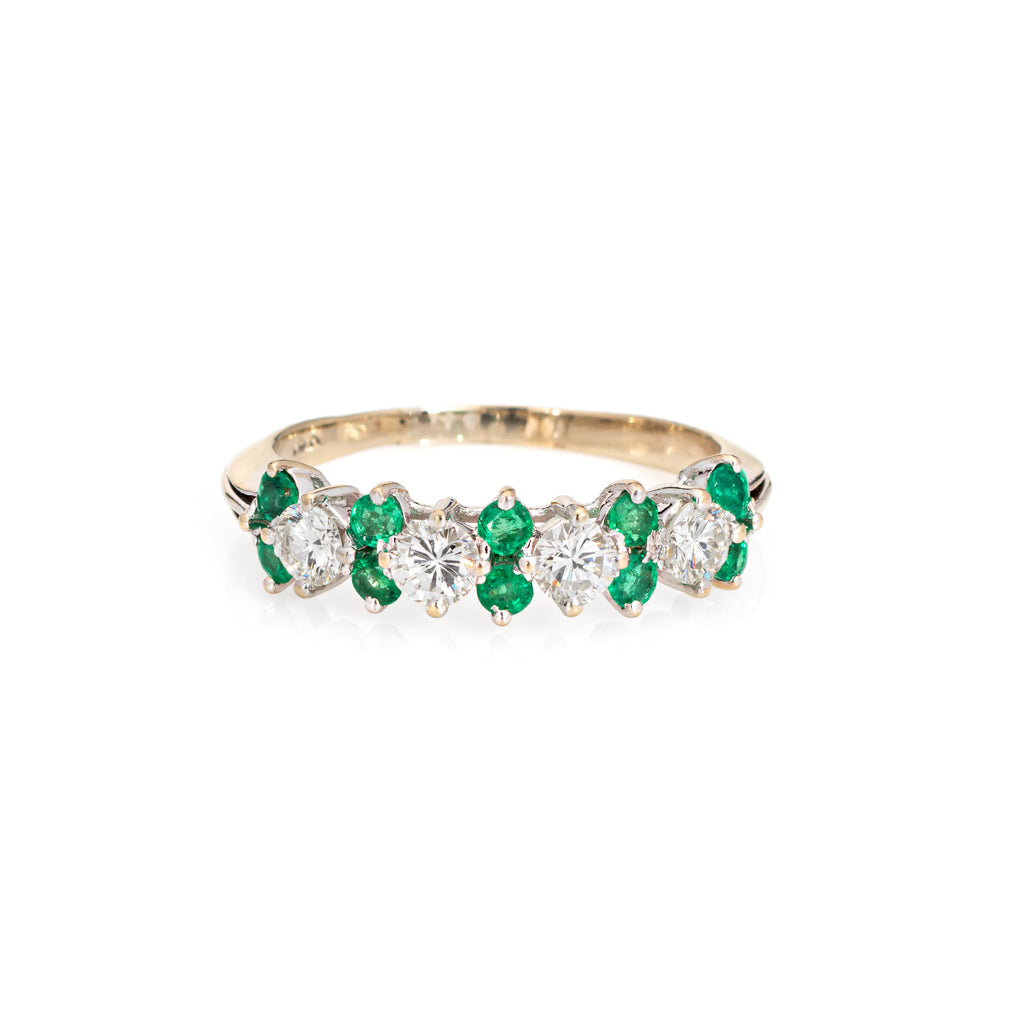Center set shimmering diamonds are framed with vibrant emeralds. The ring is great worn alone or stacked with your fine jewelry from any era. The low rise band (4.5mm - 0.17 inches) sits comfortably on the finger.