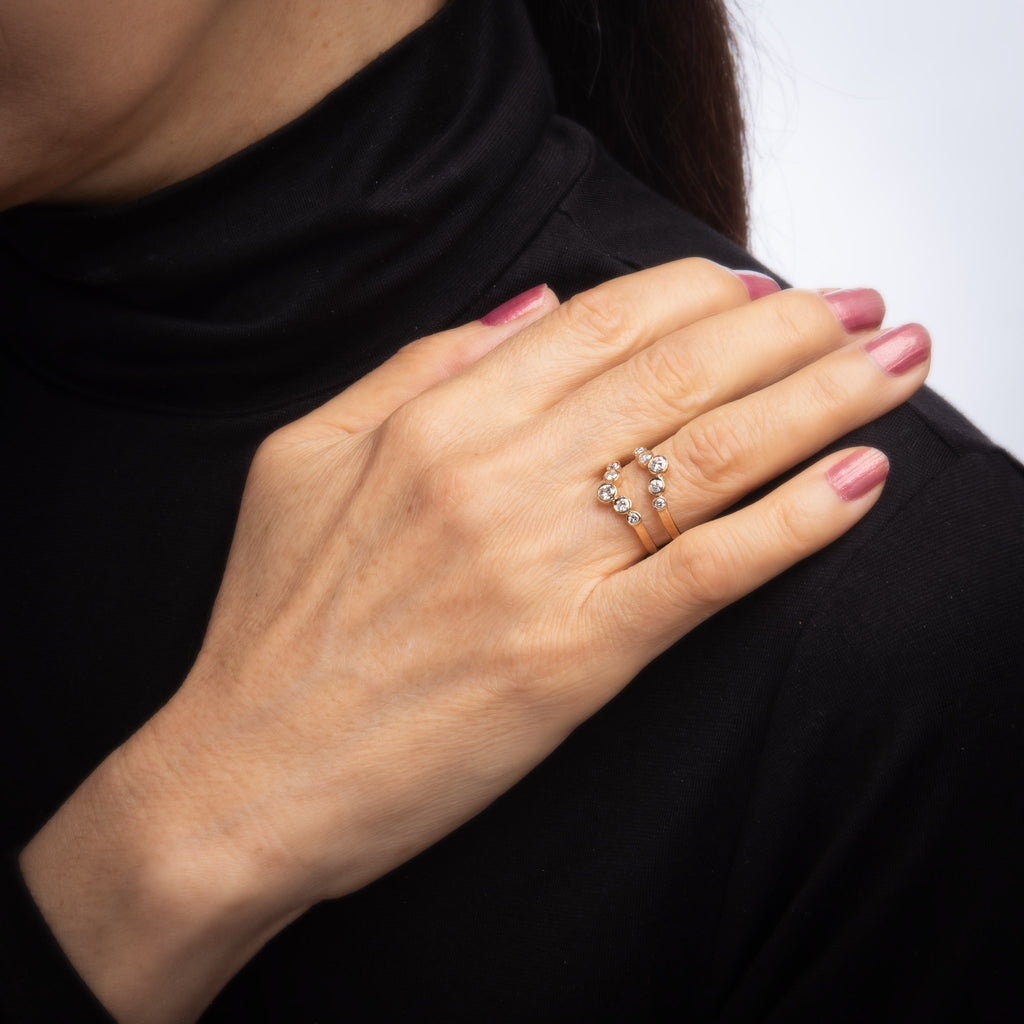The wedding ring guard features bezel set diamonds in a graduated design. The guard opening measures 6mm. The low rise ring (3mm - 0.11 inches) sits comfortably on the finger.