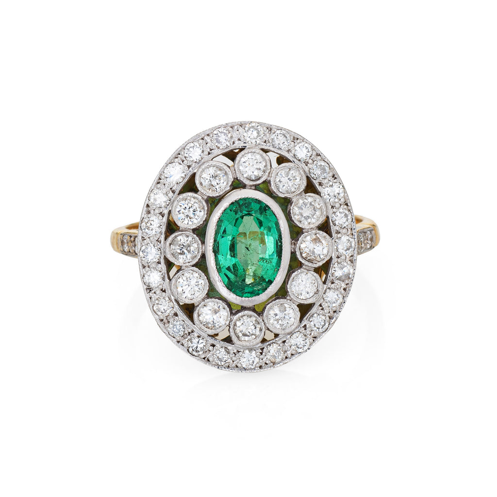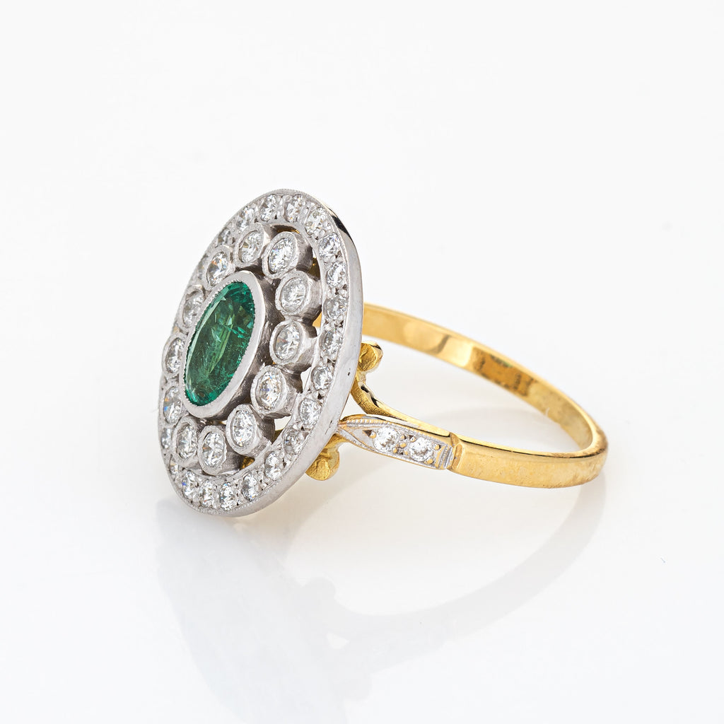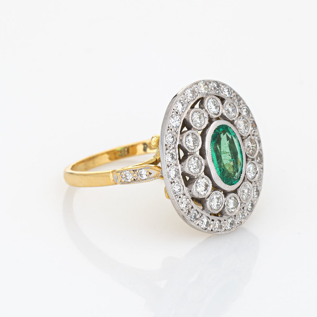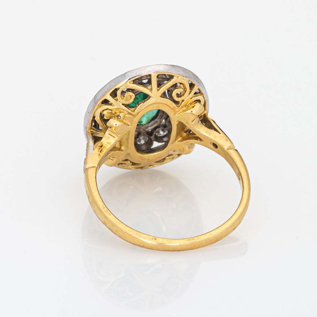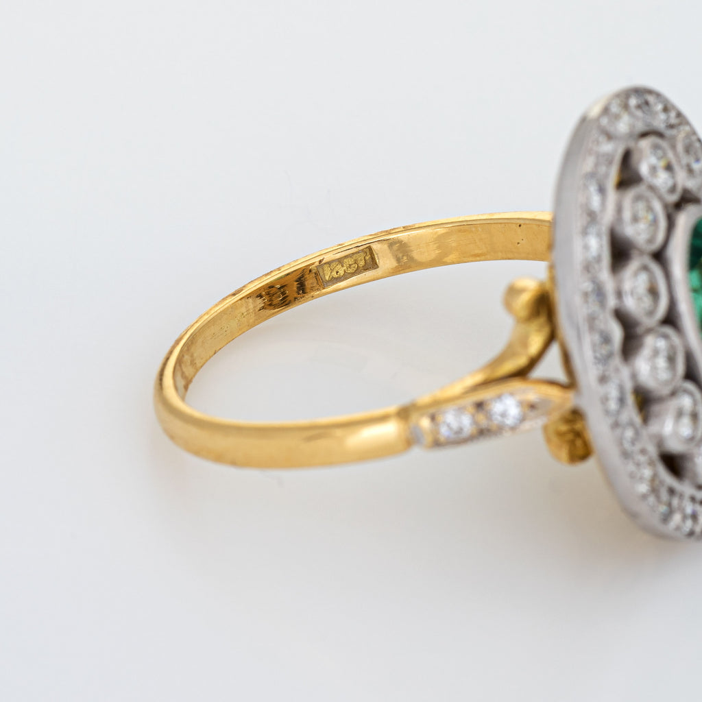 Stones: Oval faceted emerald is estimated at 1 carat, accented with an estimated 1 carat of diamonds (estimated at G-H color and VS2-SI1 clarity). The emerald is in very good condition and free of cracks or chips.