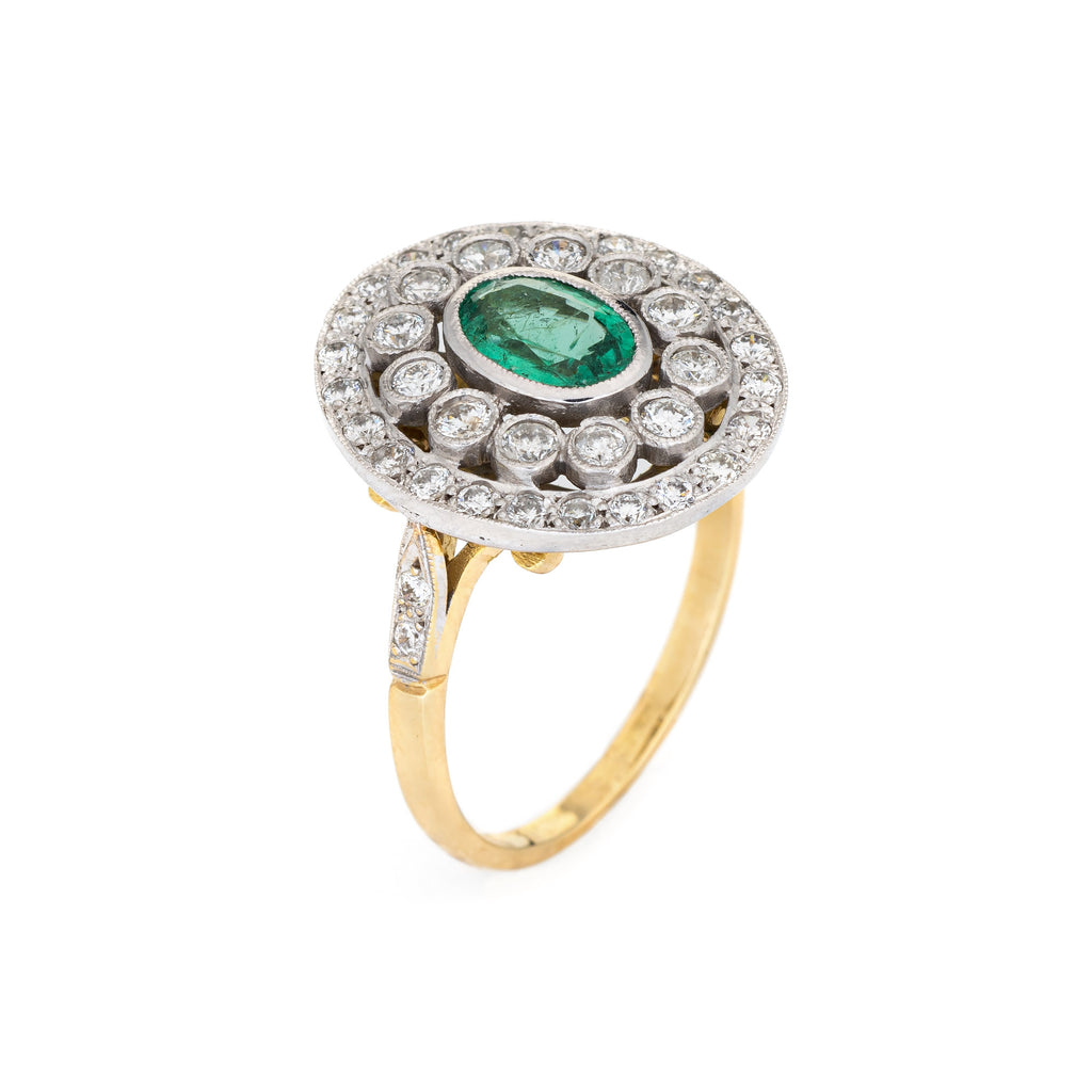 Stylish vintage emerald & diamond ring (circa 1950s to 1960s) crafted in 18 karat yellow gold.