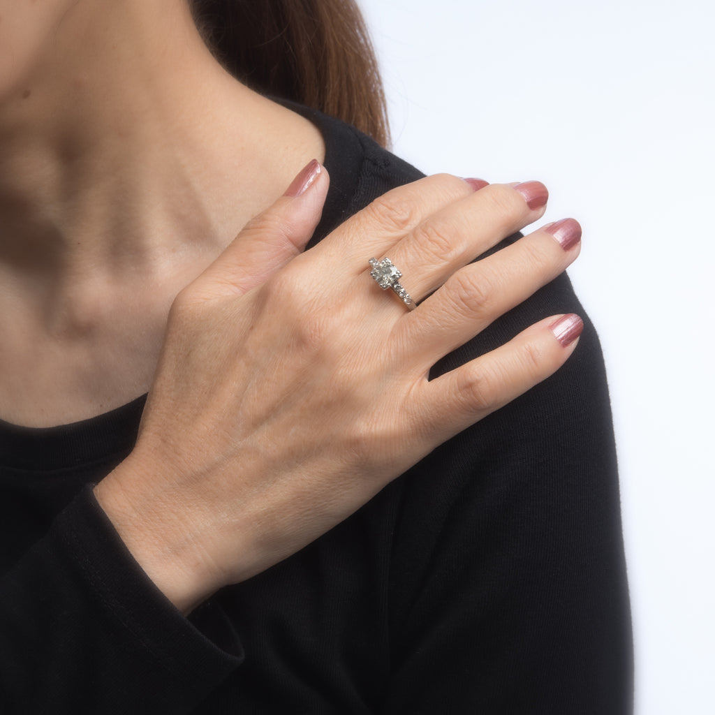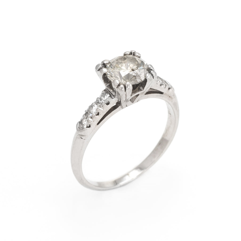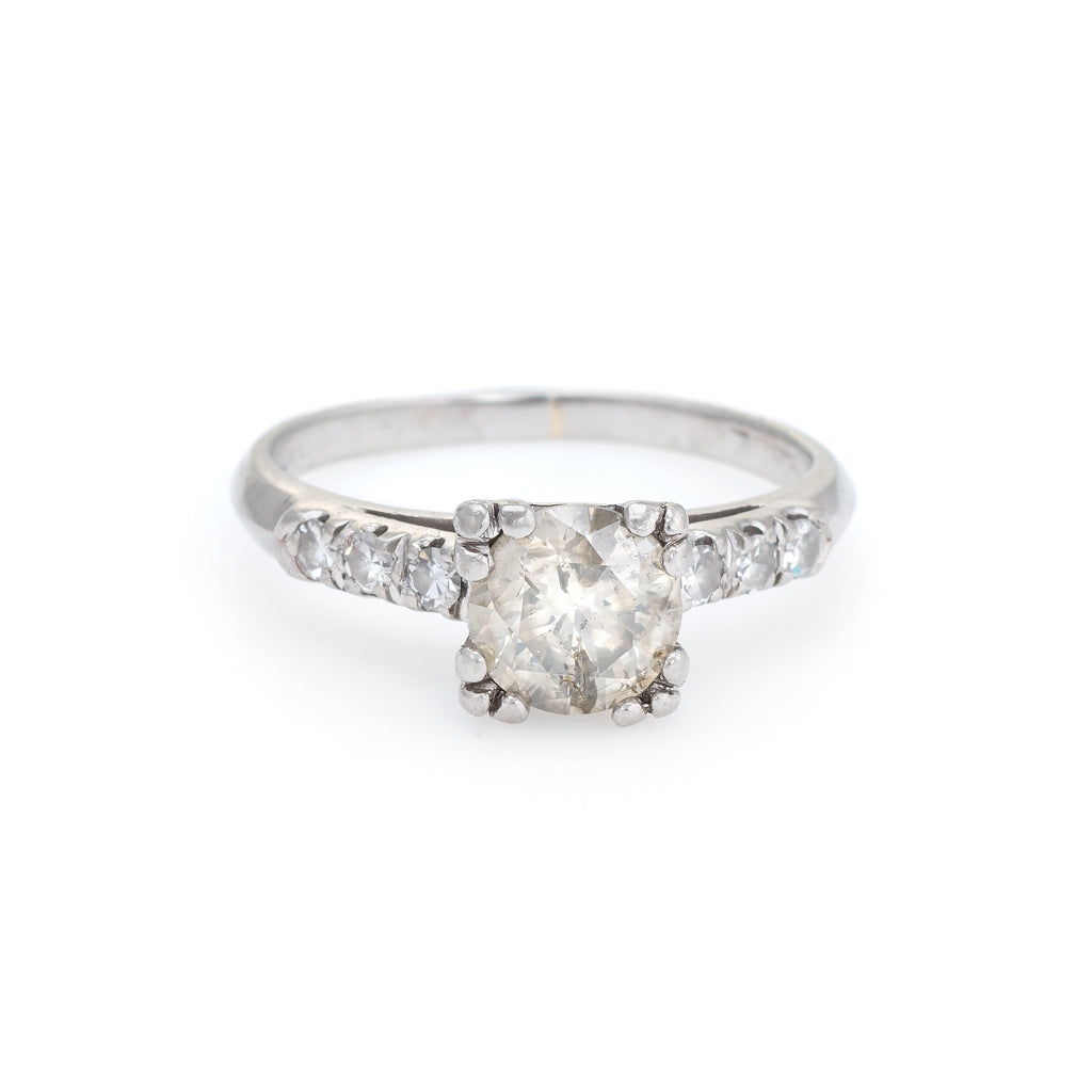 Stones: Centrally mounted estimated 1.15 carat Old European cut diamond is accented with six approx. 0.03 carat single cut diamonds. The total diamond weight is estimated at 1.33 carats. The center diamond is estimated at K-L color and I2-3 clarity. The side diamonds are estimated at H-I color and VS2-SI1 clarity.