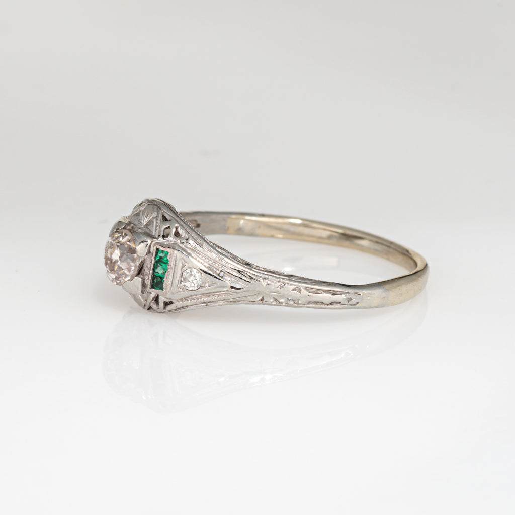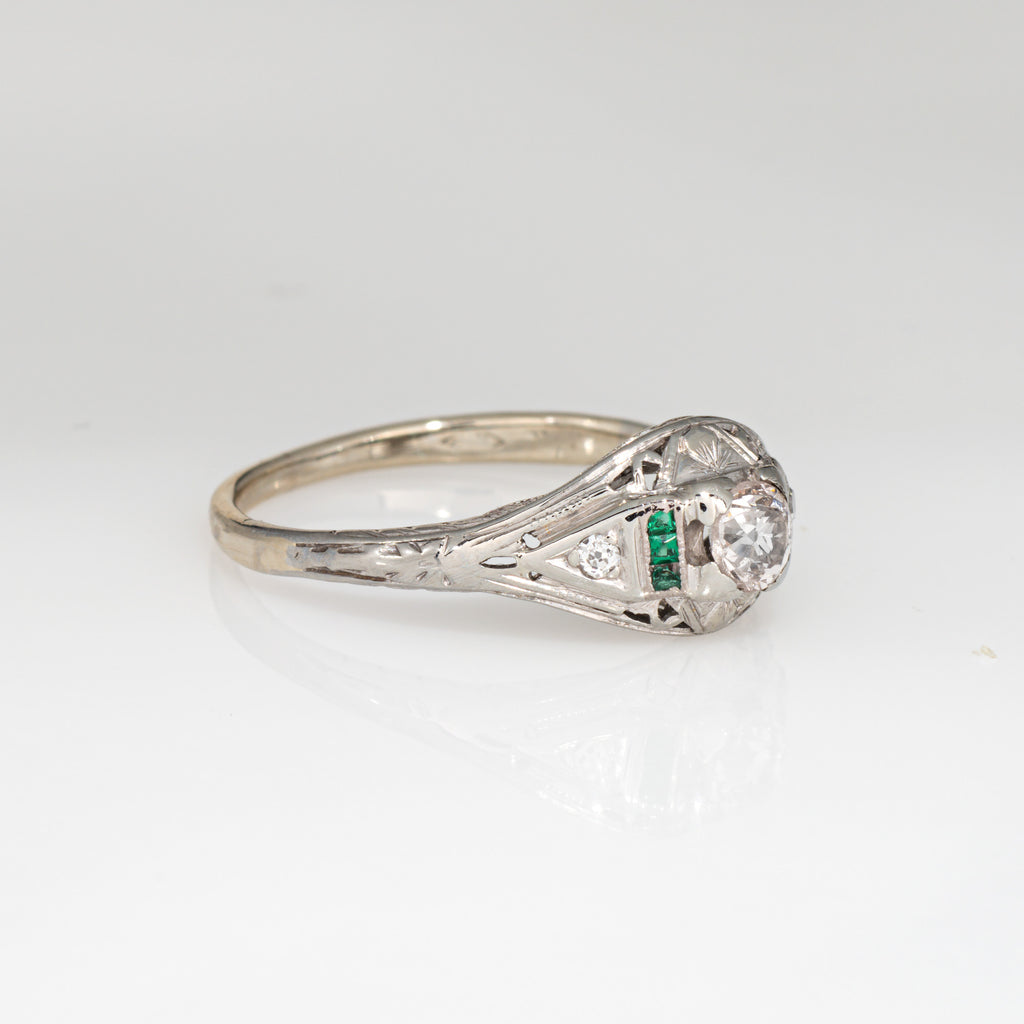 Finely detailed vintage Art Deco diamond & emerald ring (circa 1920s to 1930s) crafted in 14k white gold.