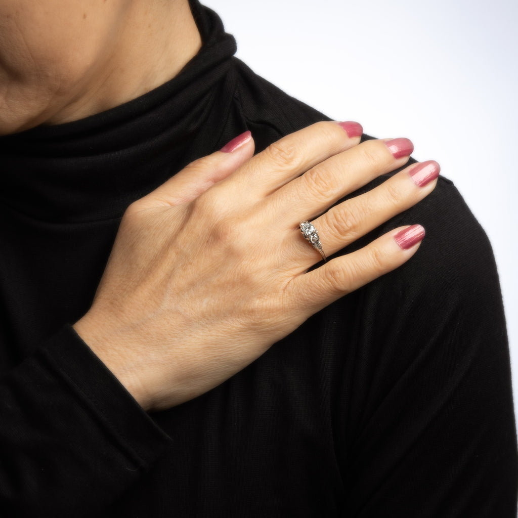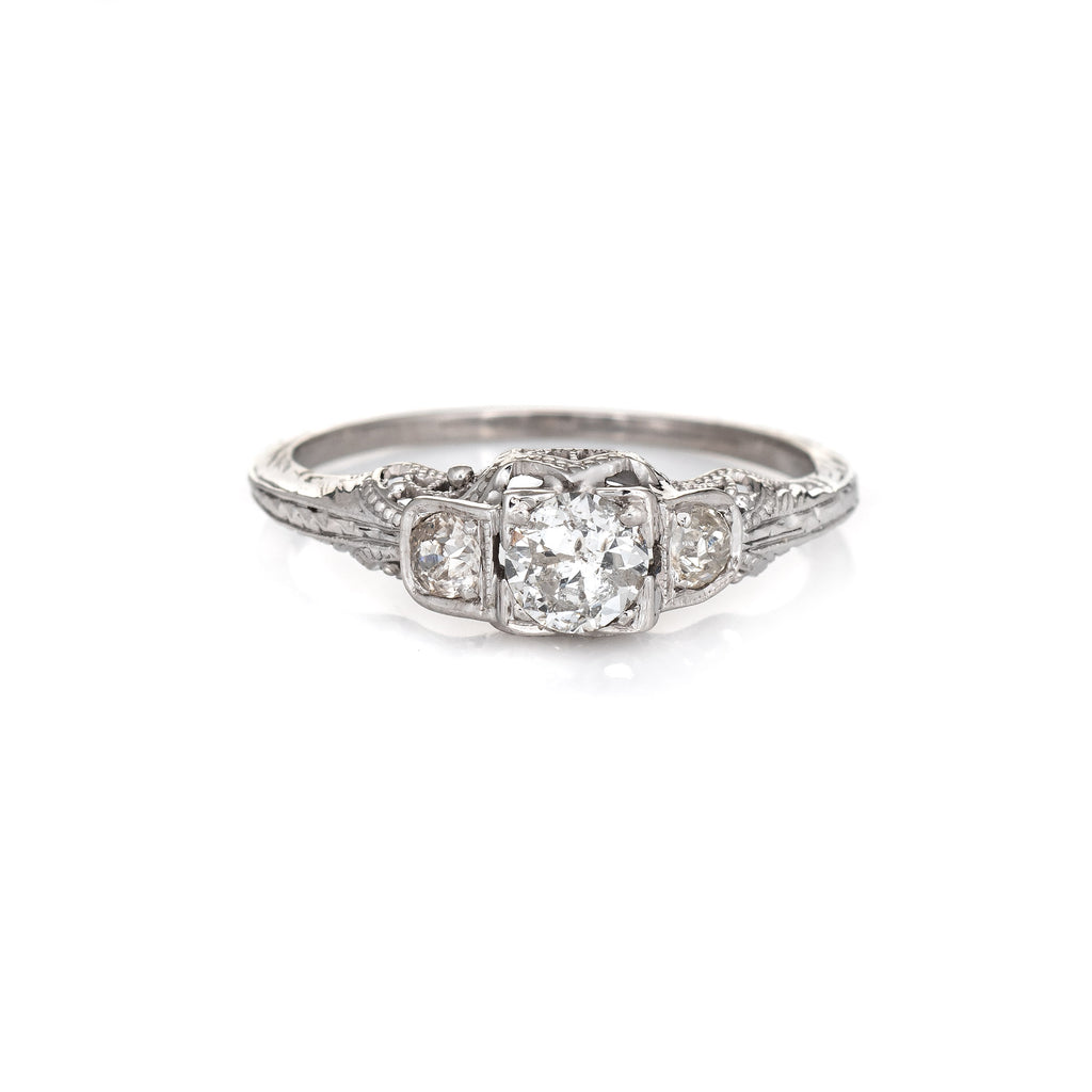 Stones: Centrally mounted estimated 0.34 carat old European cut diamond is accented with two estimated 0.05 carat old mine cut diamonds. The total diamond weight is estimated at 0.44 carats (estimated at I-J color and SI2-I2 clarity).