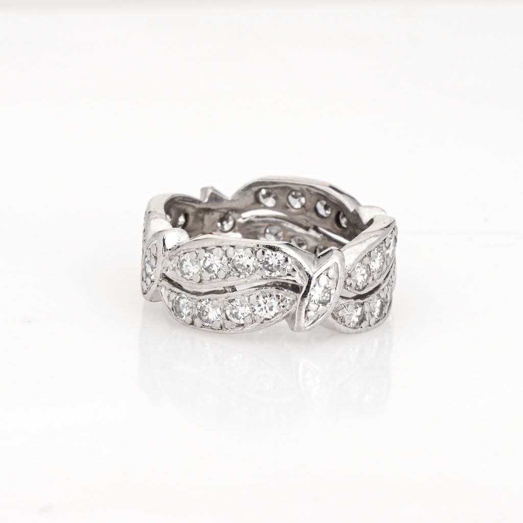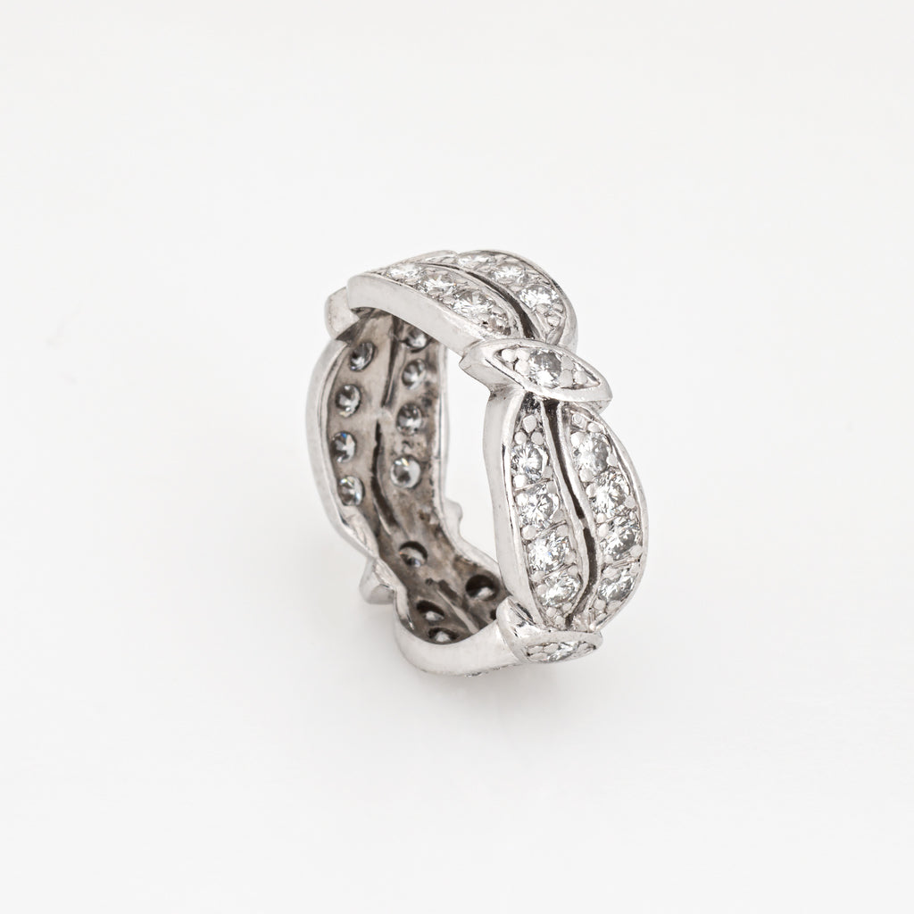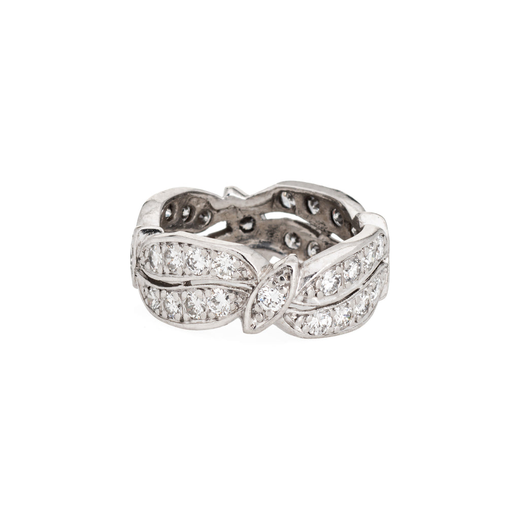 The ring epitomizes vintage charm and would make a lovely alternative wedding band. The band features a diamond set wave like pattern with navette stations. The ring is ideal worn alone as a statement band or stacked.