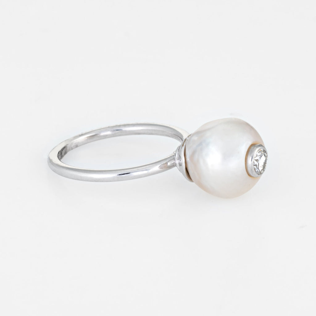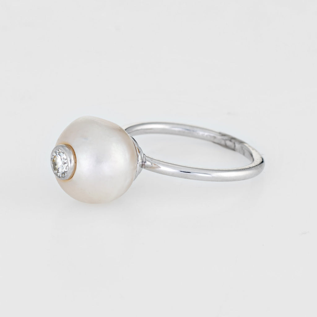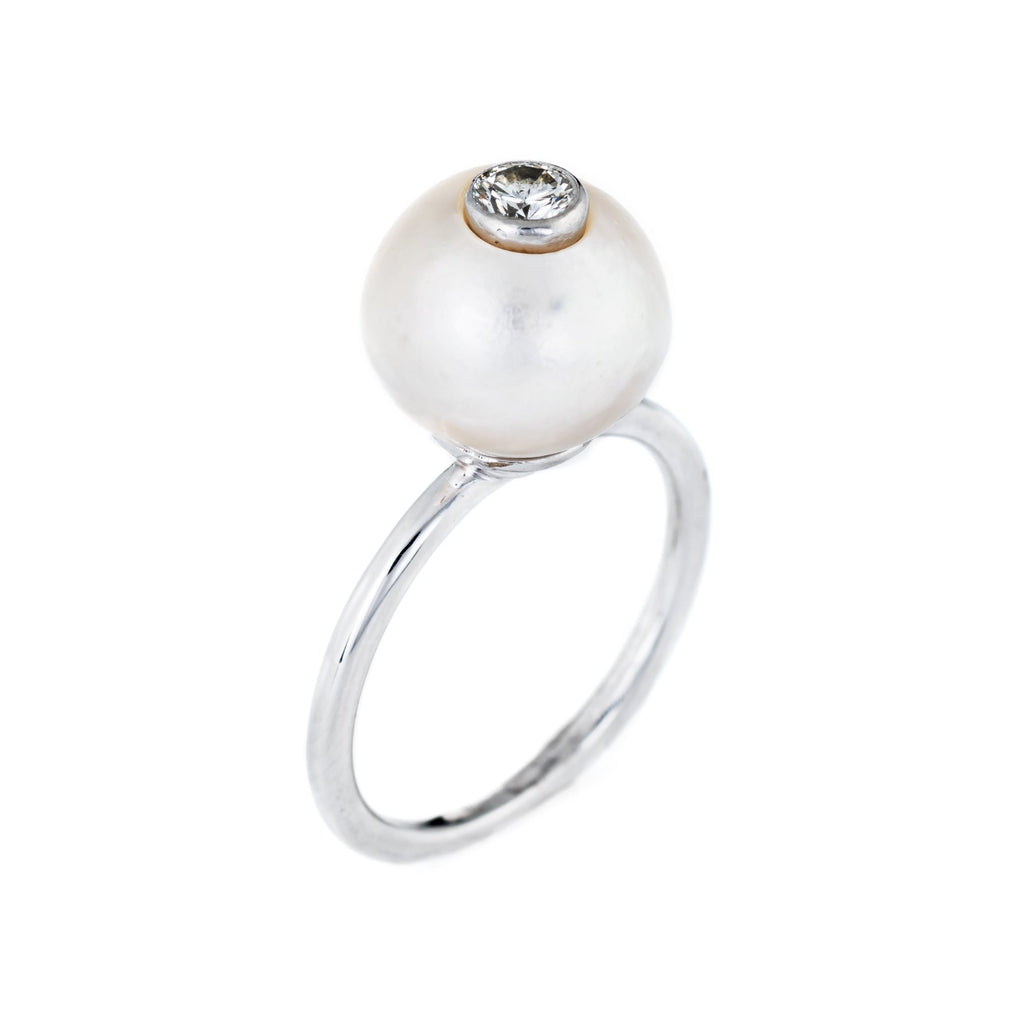 The stylish high rising ring features a gemstone-in-gemstone design. The diamond is artfully bezel set into the pearl for a striking and unusual look . A great ring to wear alone or stacked with your fine jewelry from any era.