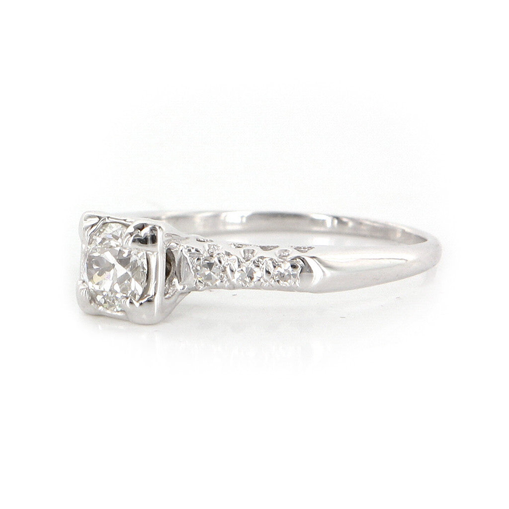 An old European cut diamond totaling an estimated .50 carat is accented by an estimated .12 carat of single cut diamonds.