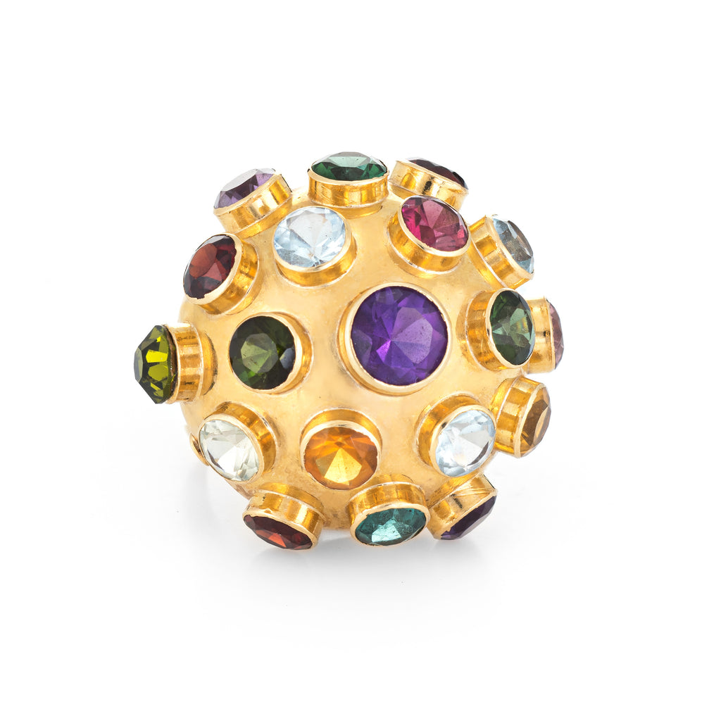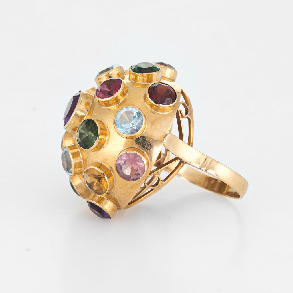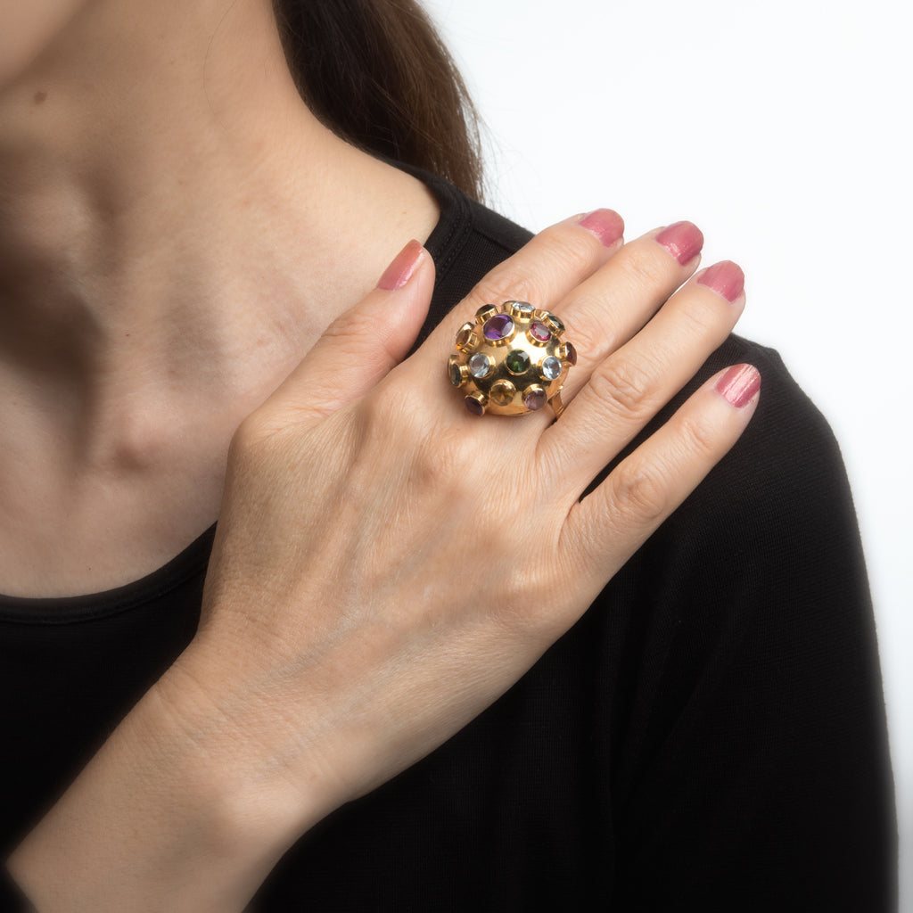 Ornate H Stern sputnik domed gemstone cocktail ring (circa 1950s to 1960s), crafted in 18 karat yellow gold.