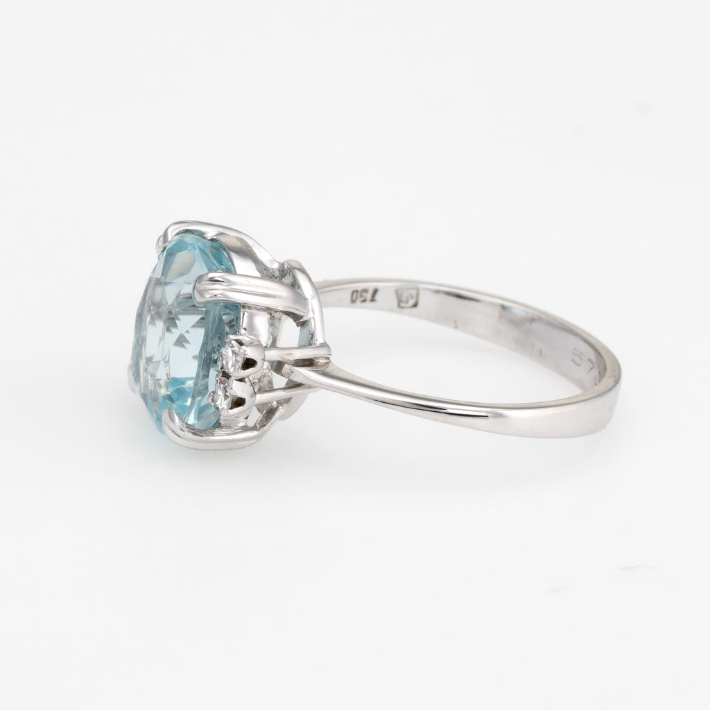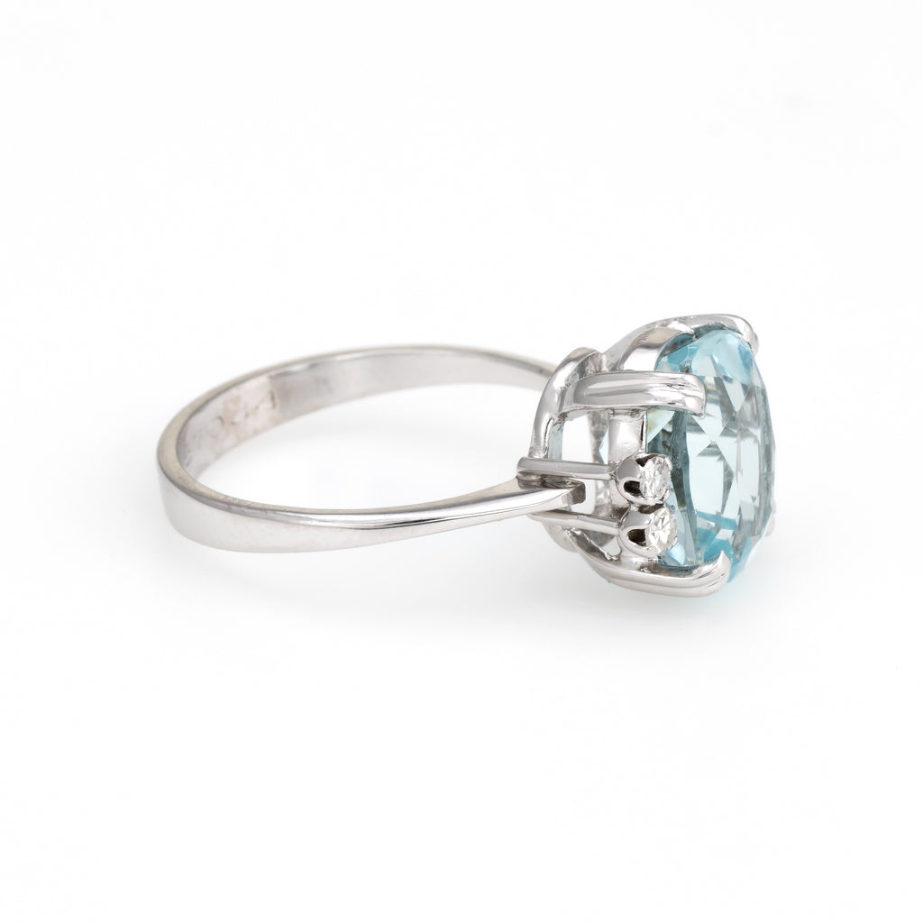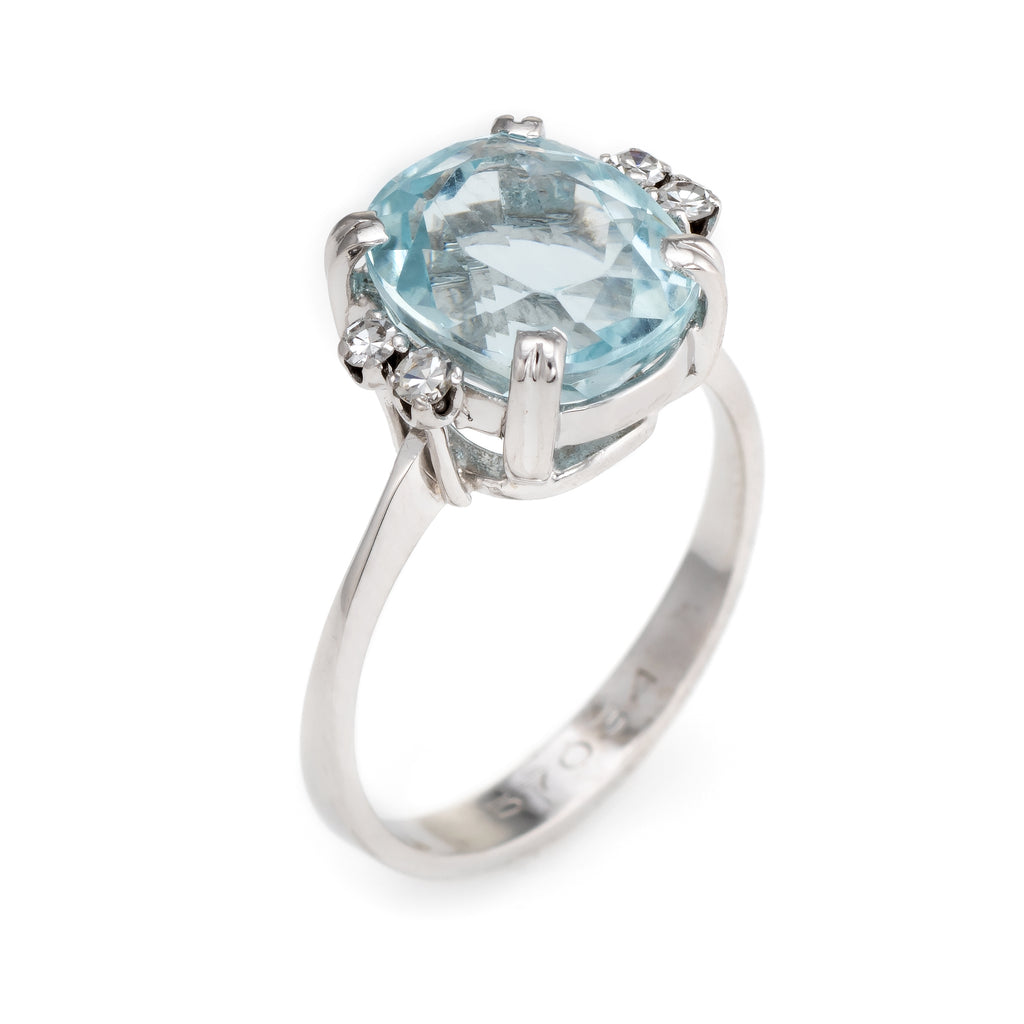 Stones: Faceted oval cut aquamarine measures 10.5mm x 9mm (estimated at 5 carats), accented with four estimated 0.02 carat single cut diamonds. The total diamond weight is estimated at 0.08 carats (estimated at G-H color and VS2 clarity). The aquamarine is in excellent condition and free of cracks or chips.