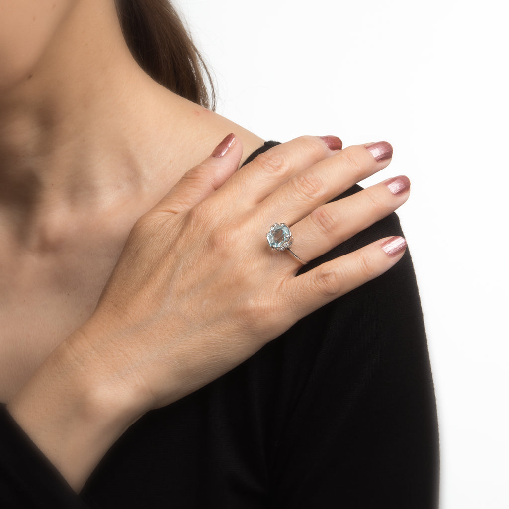 The elegant design highlights the aquamarine. H Stern is Latin America's leading jeweler know for bold and distinct designs. The colorful ring is ideal worn alone or as an alternative engagement ring.