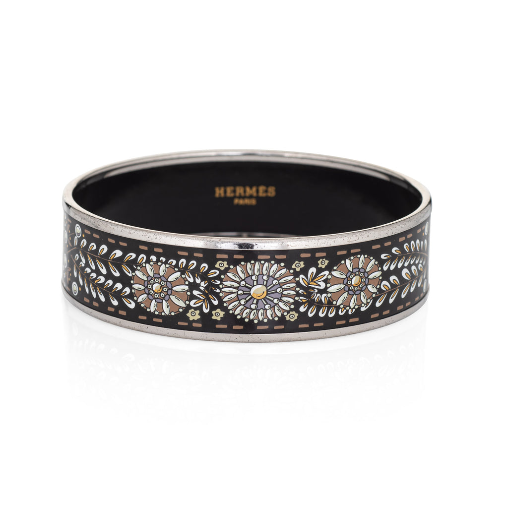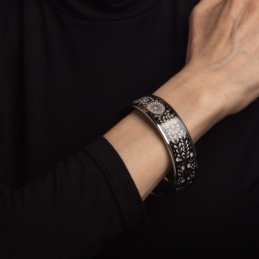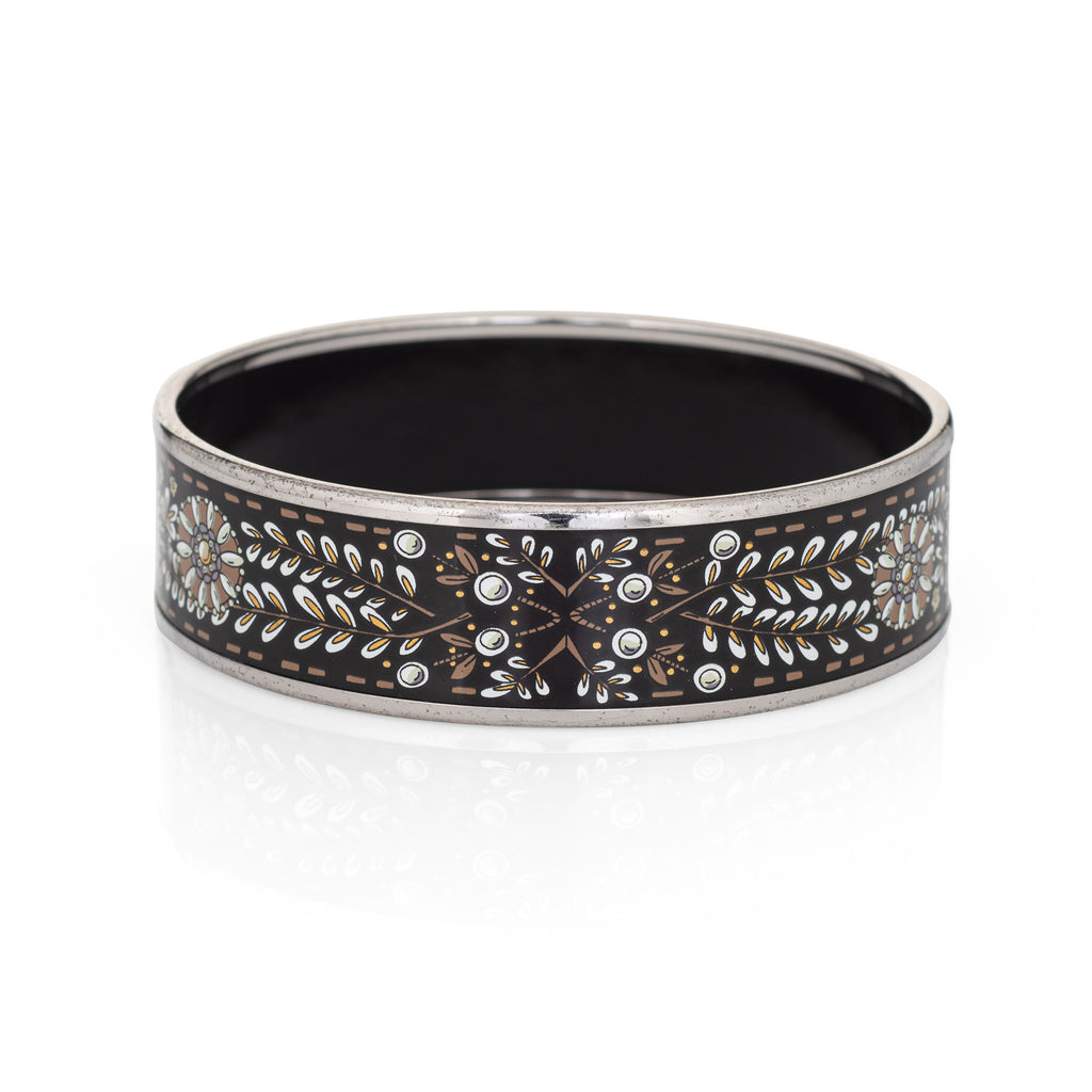 Pre-owned vintage Hermes enamel bracelet with a black, white and gold printed flower design and palladium plated hardware.