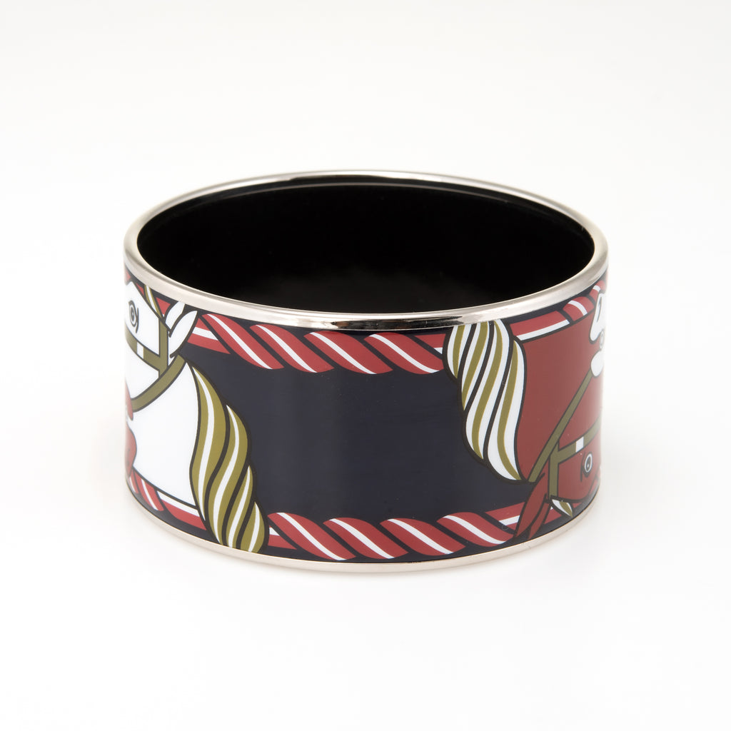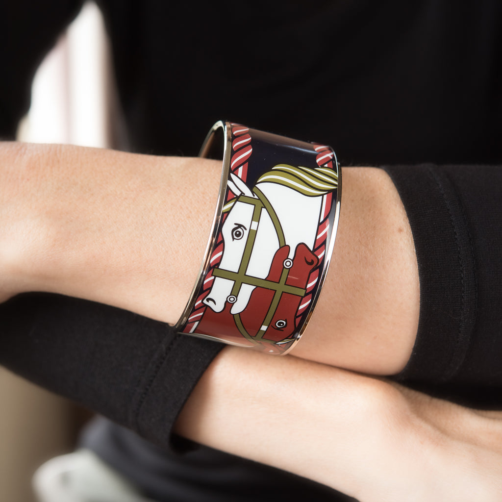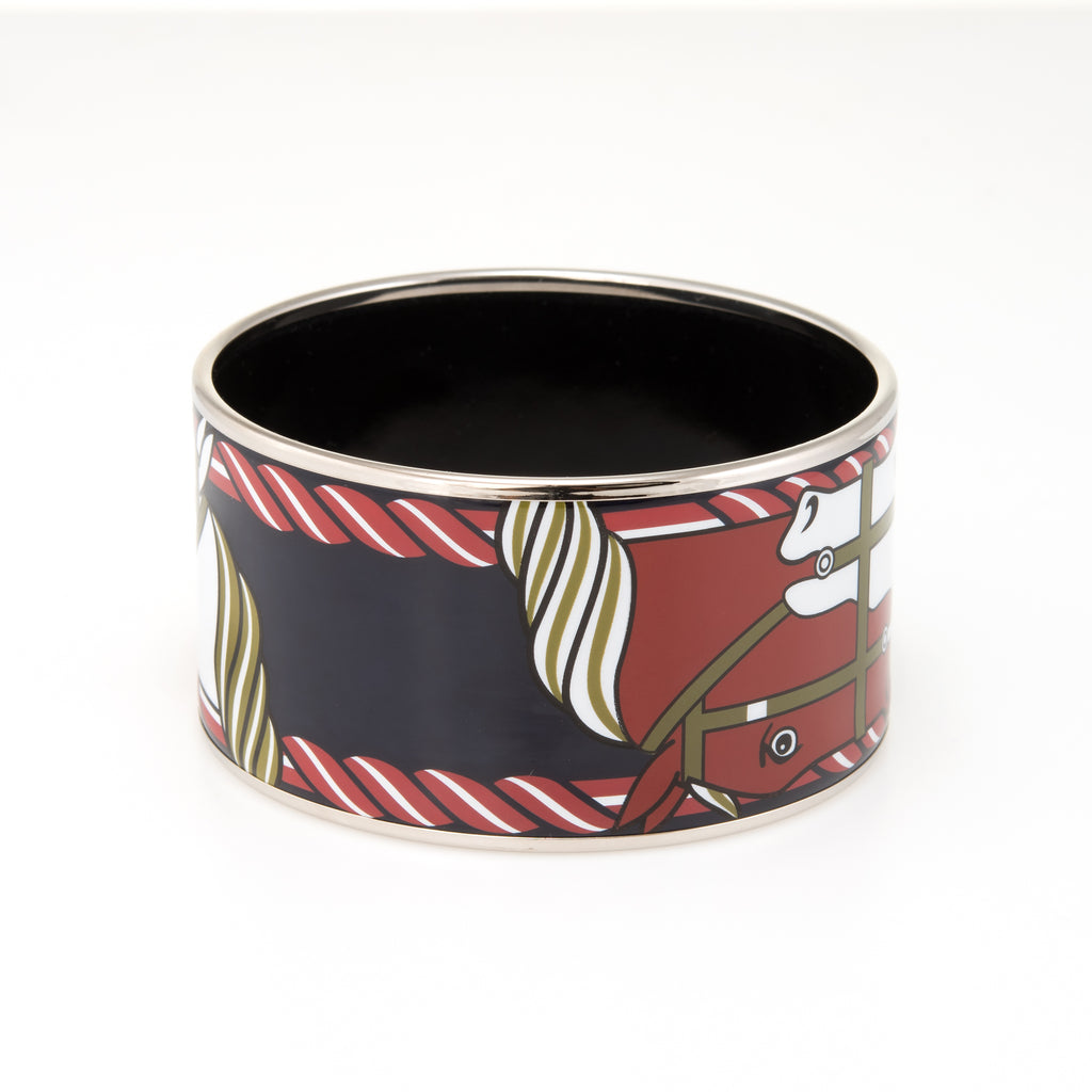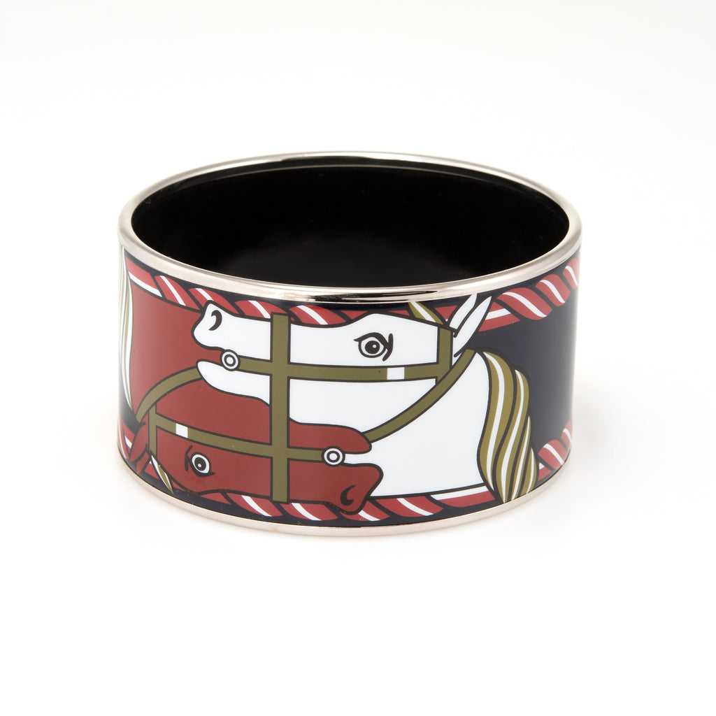 Pre owned Hermes enamel bracelet with a black, white and red printed equestrian design.