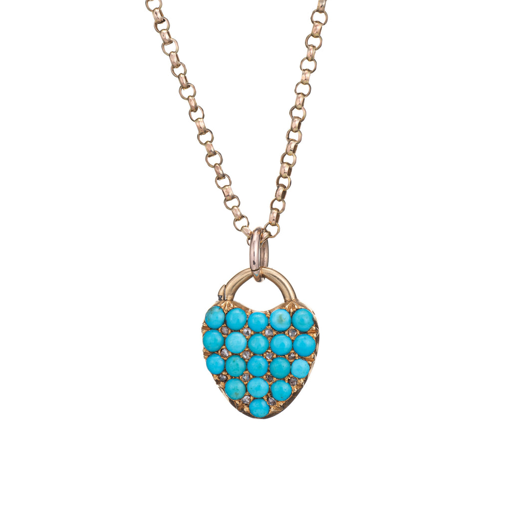 Stylish and finely detailed antique Victorian turquoise & diamond heart locket pendant & necklace crafted in 15k yellow gold (pendant) and 9k yellow gold (chain), dating to the late 1880s to 1900s.