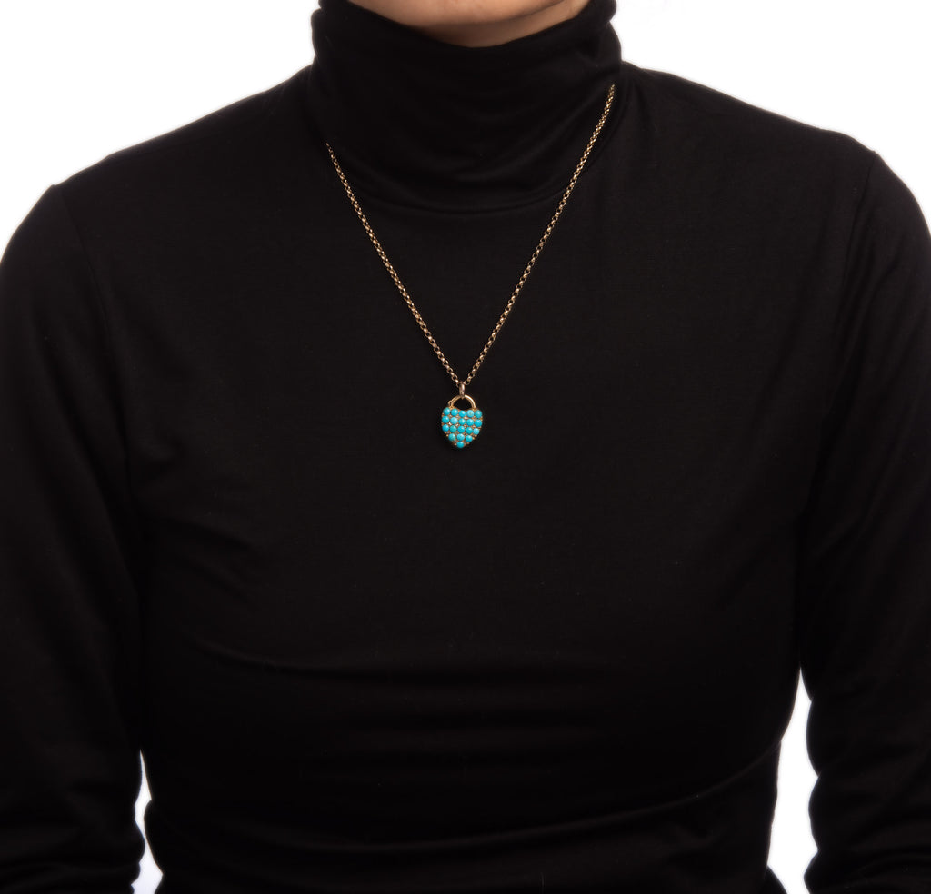 The sweet, heart shaped locket is pave set with bright turquoise cabochons with accenting small rose cut diamonds, adding a subtle shimmer. The belcher link chain measures 18 inches in length. Please note that the locket does not open. A fabulous antique necklace that is great worn alone or layered with your fine jewelry from any era.