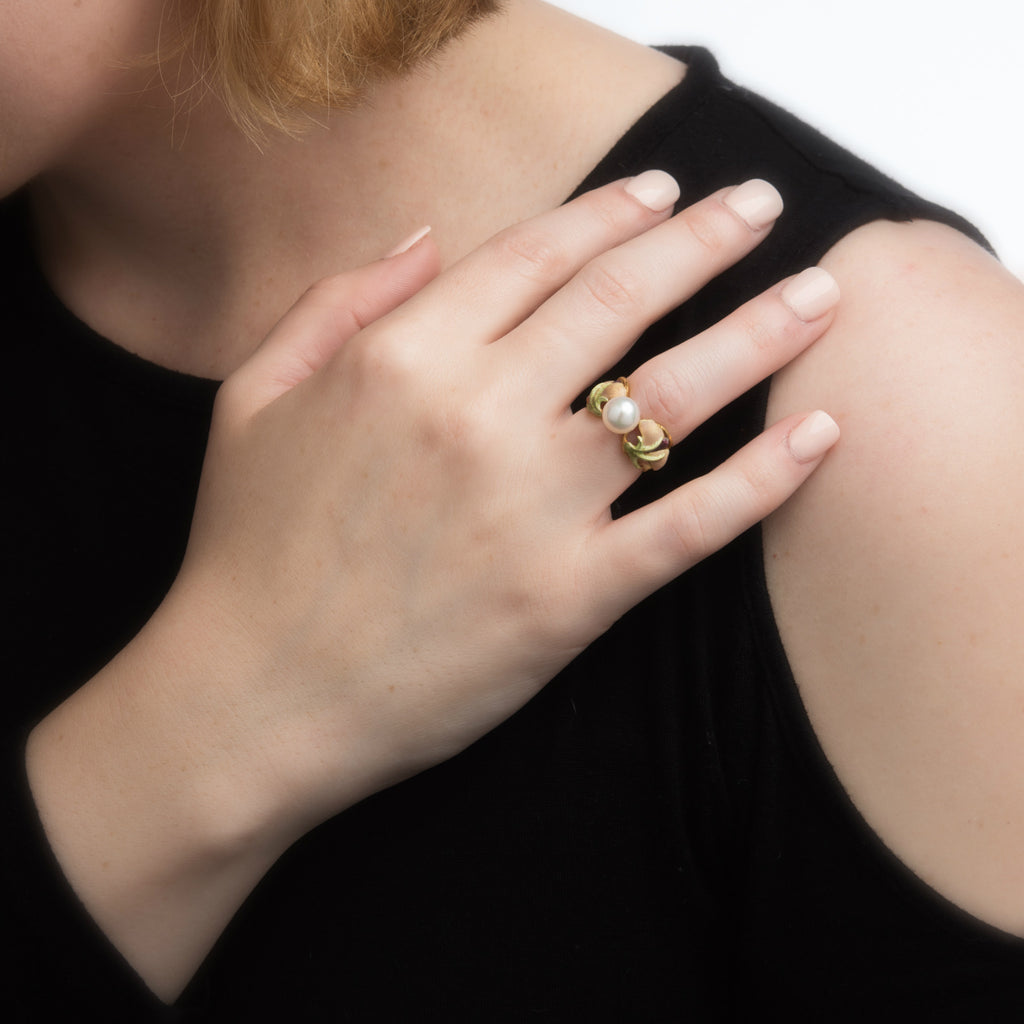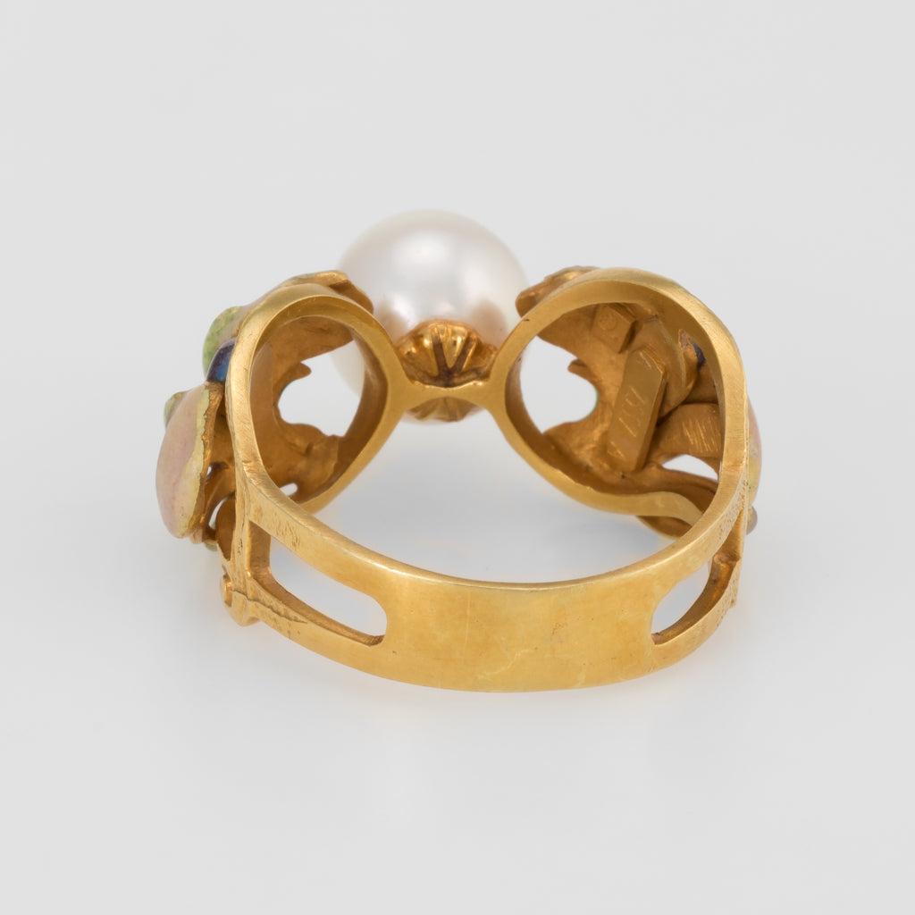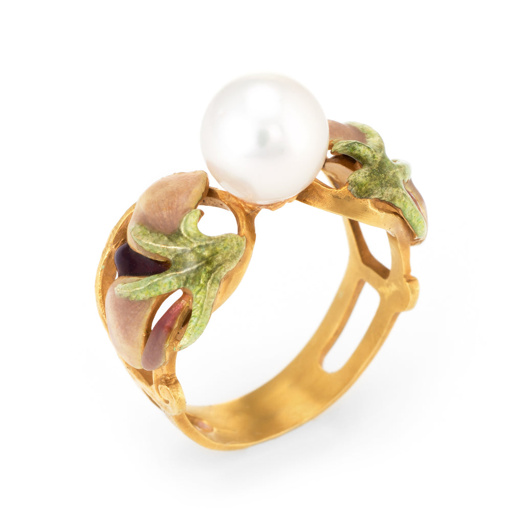 Stones: Centrally mounted cultured pearl measures 8mm. The pearl is lustrous with a thick nacre and shows a lovely rose overtone. The enamel is in excellent condition and free of cracks or chips.