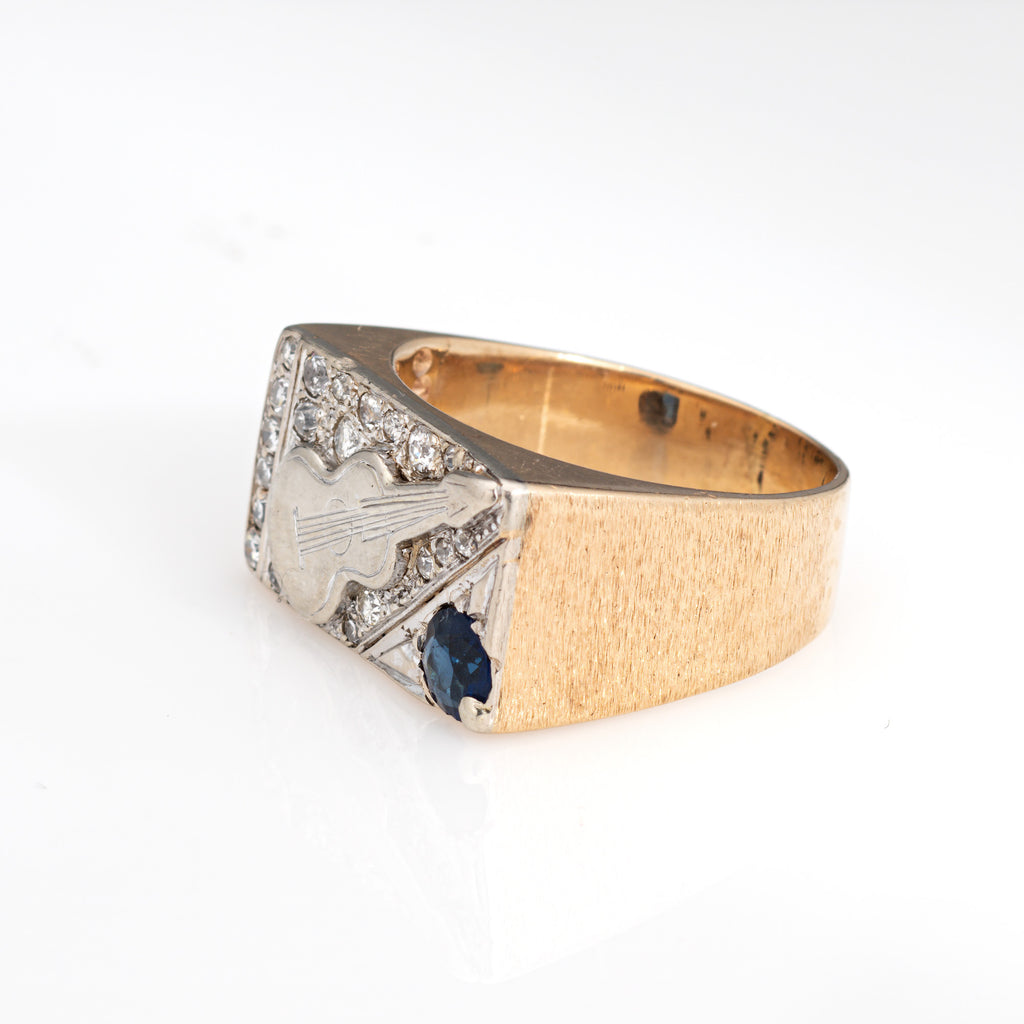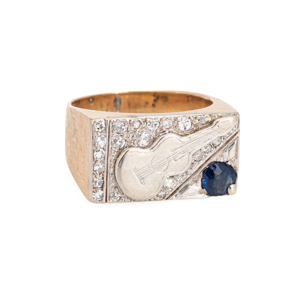 The fab 70s era ring highlights a guitar with diamonds set in scattered form and a blue sapphire to the base. The east to west facing ring weighs 18.2 grams and has a hefty feel on the hand. The side shoulders feature a florentine finish. The low rise ring (3.5mm - 0.13 inches) sits comfortably on the finger.