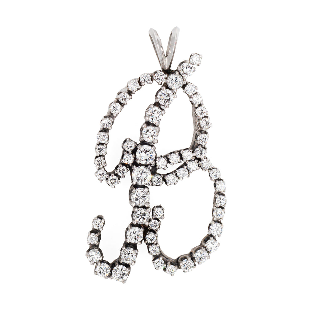 Finely detailed vintage diamond letter "B" pendant crafted in 14k white gold (circa 1950s to 1960s).