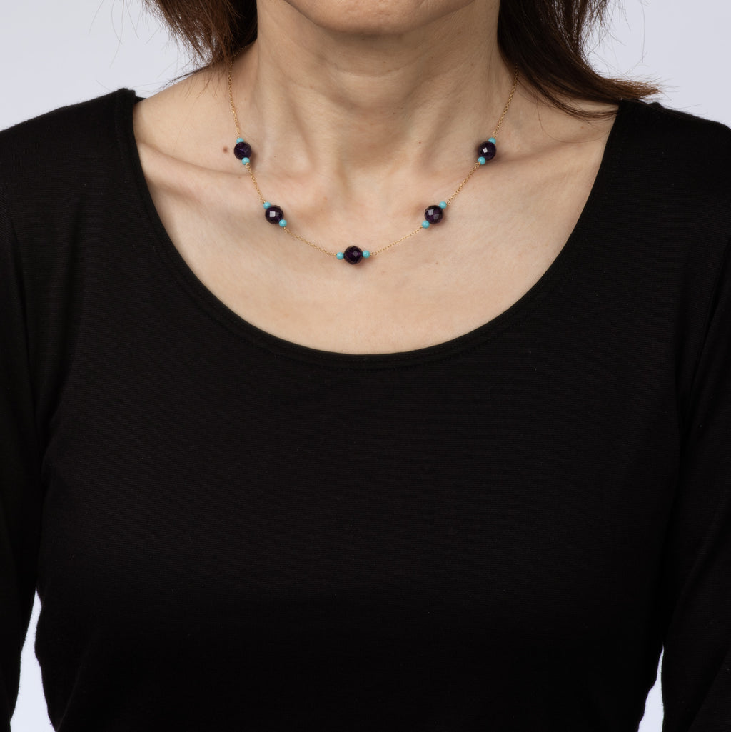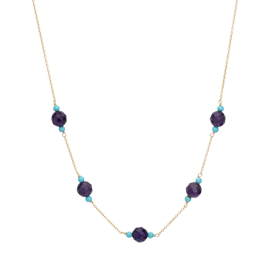 Stylish and finely detailed amethyst & turquoise necklace crafted in 14k yellow gold stations.