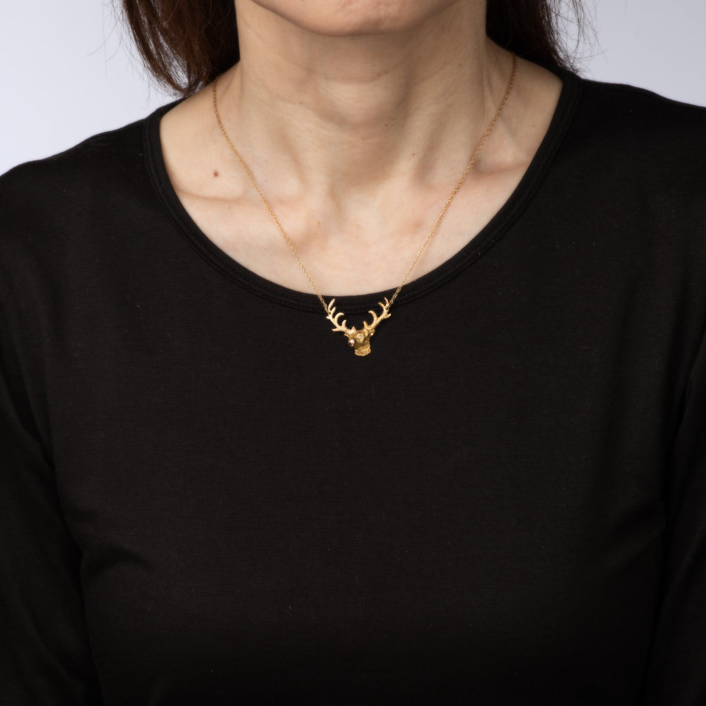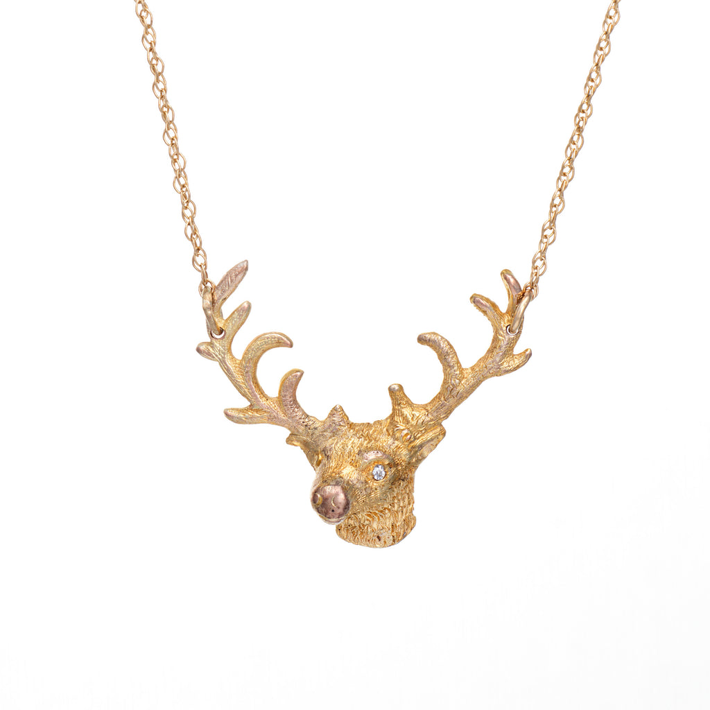 Deer Antler Bust Necklace Vintage 14k Gold Diamond 19" Chain Animal Jewelry