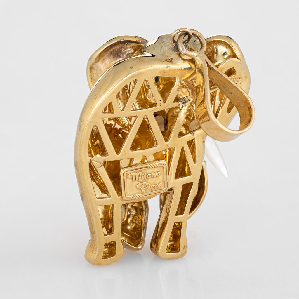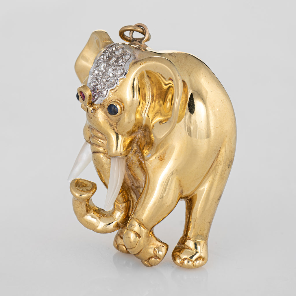 The large elephant makes a unique statement! The pendant features lifelike detail with diamonds pave set to the head and the tusks set with mother of pearl. A heavy, weighty piece at 26.2 grams of 18k gold.