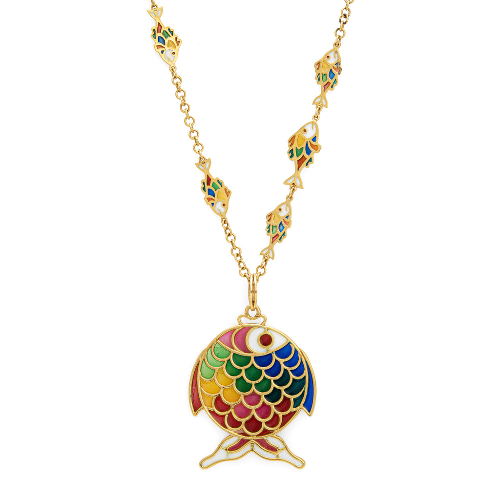 The beautifully detailed necklace highlights a large fish pendant (attached to the chain) and smaller fish embedded into the chain. The translucent plique a jour enamel (a French term for "letting in daylight") glows in natural sunlight. Similar to stained glass windows the fish lights up in a beautiful rainbow display of colors. Weighing 49 grams the necklace has a weighty feel to the touch. The chain measures 26 inches in length and is great worn alone as a statement piece or layered to create a truly memorable look.