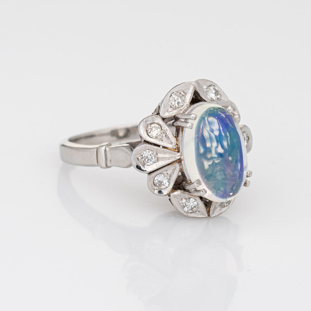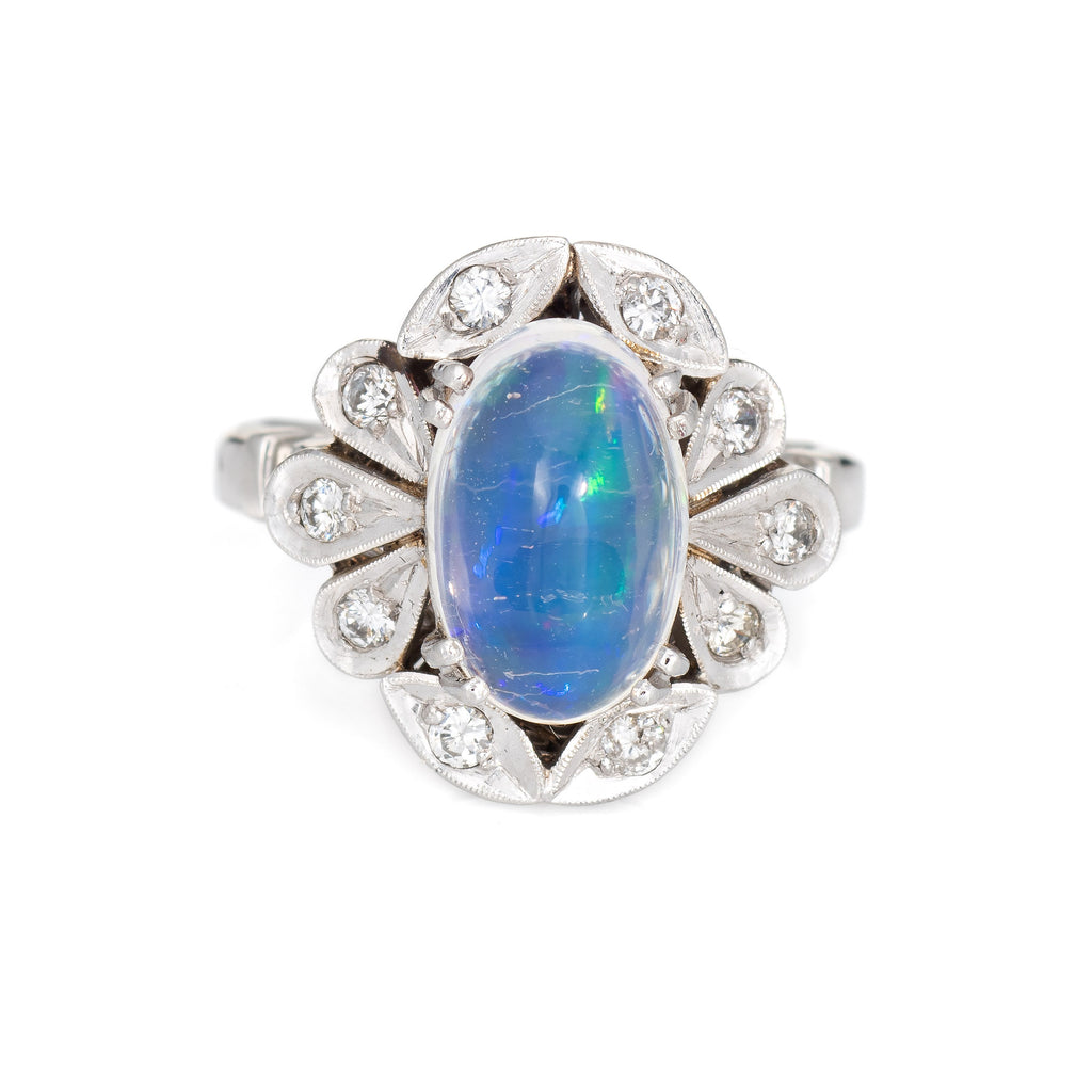 Stones: Cabochon cut natural jelly opal, 3.15 carats (11.33 x 7.29 x 6.31mm). The opal is in excellent condition and free of cracks or chips. The opal exhibits a strong play of colors from blue to green, turquoise, orange yellow and bits of red. Surrounding the opal is 10 full cut round diamonds, total weight approx. 0.25ct, G-H color, VS-SI qualities, good cuts.