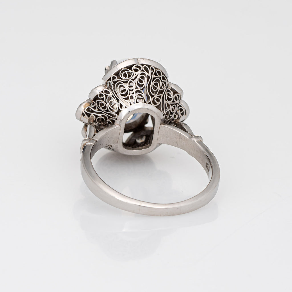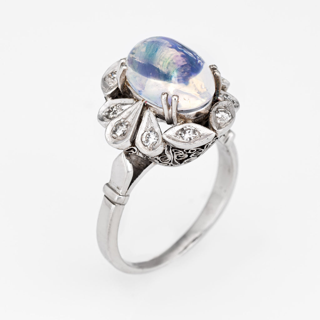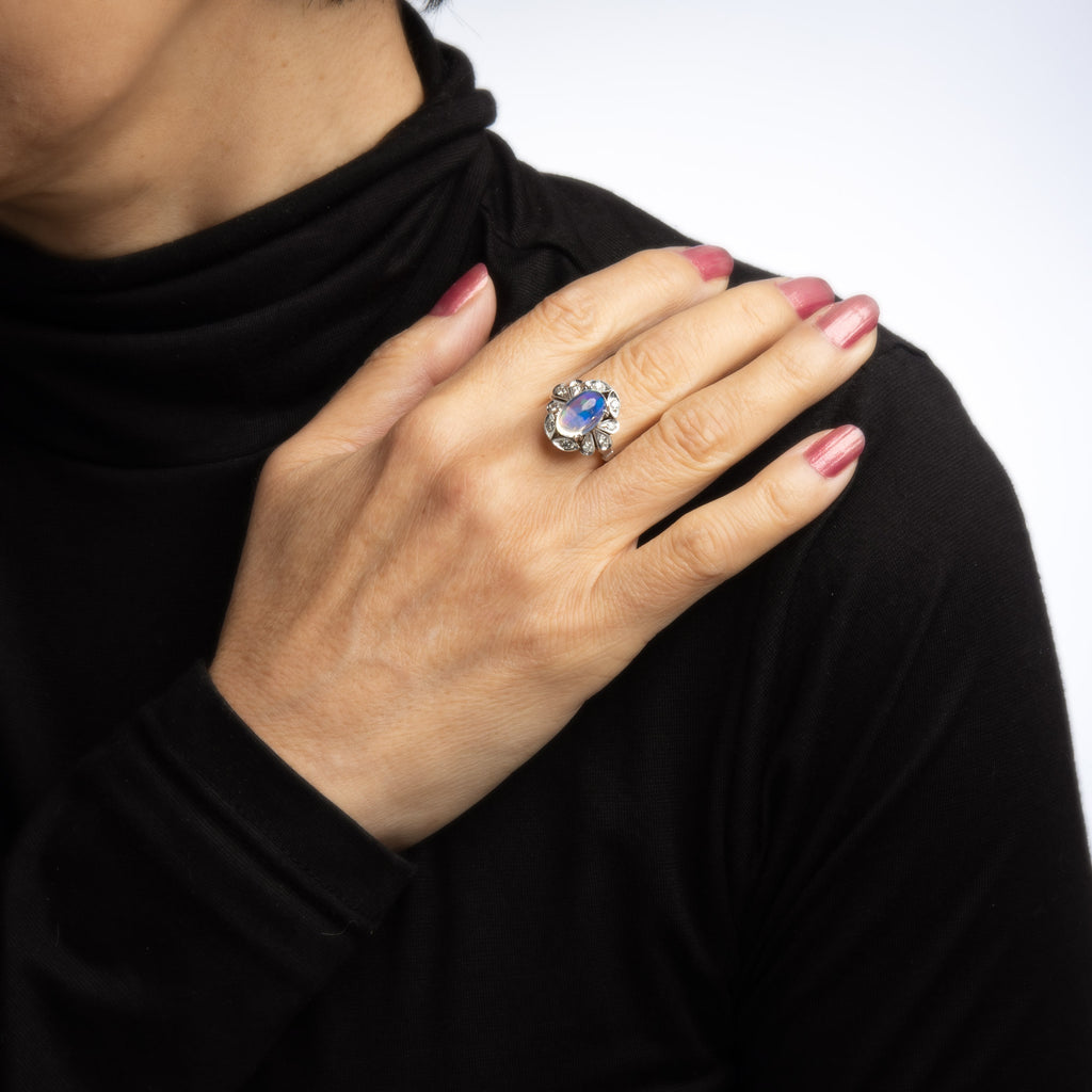 The jelly opal lights up in natural sunlight, with interchangeable colors as alluring as confetti. Jelly opals have a wonderous watery like appearance showing strong color flashes with every movement of the ring. The cocktail ring is medium in scale and makes a nice statement on the hand. The medium rise ring (13mm - 0.51 inches) sits comfortably on the finger. The ring is in very good condition. We have not cleaned it in order to preserve the patina and collector value.