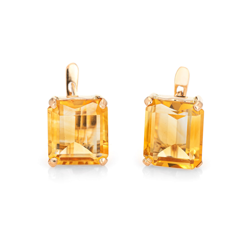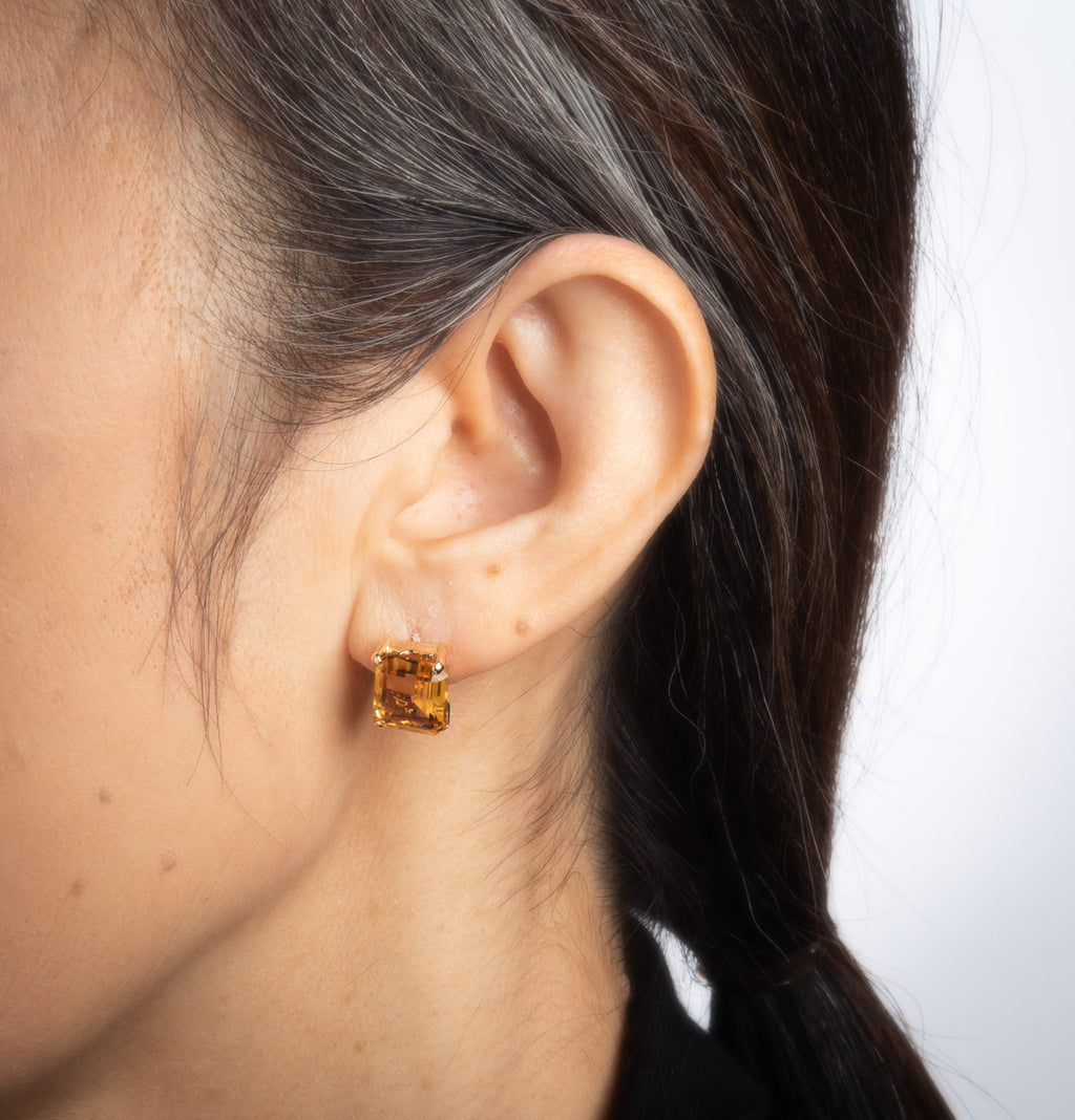 The stylish earrings feature emerald cut citrines with a warm honey colored hue. The citrines are set in secure four pronged mounts. The earrings are fitted with post and lever backings.
